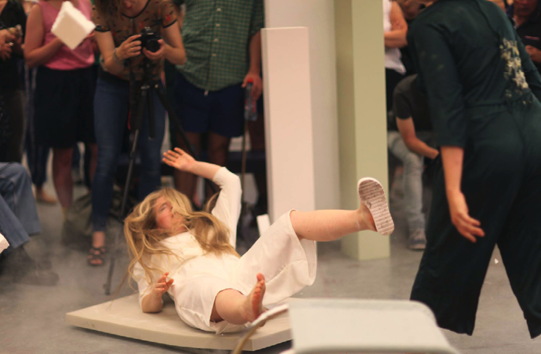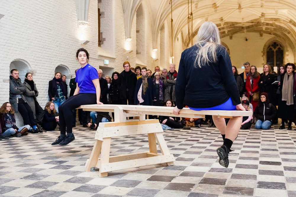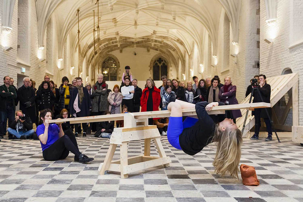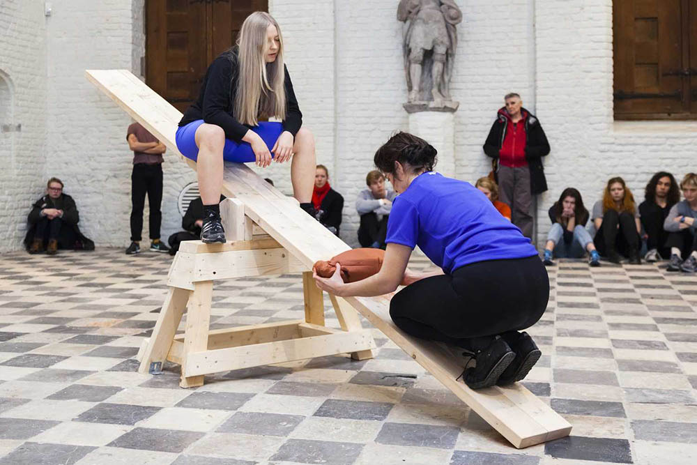 We were invited to develop a new version of this Dance Construction, which Simone Forti once described as a “domestic drama.” Forti began creating her “Dance Constructions” in 1960, combining ordinary movements—walking, sliding, and climbing—with everyday objects like ropes and plywoo boards. In the original version of Seesaw, Yvonne Rainer and Robert Morris balanced their bodies as they moved up and down a long plank. Given freedom to reinterpret Seesaw, we focused on its core dynamics of reciprocity and balance, exploring how the object invites any duo to confront and navigate these themes. The performance blends choreographed and improvised movements with gestures from earlier iterations, contributing to a layered archive of Seesaw. Shown as part of Simone Forti’s solo show Here It Comes at Vleeshal Center for Contemporary Art in Middelburg, January–April, 2016