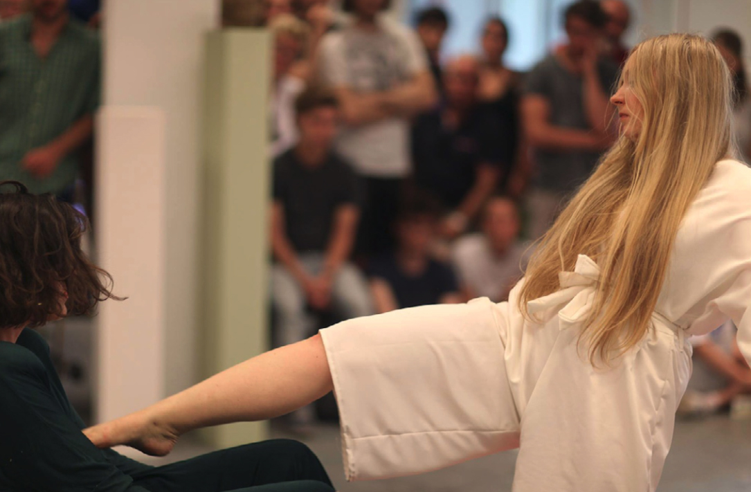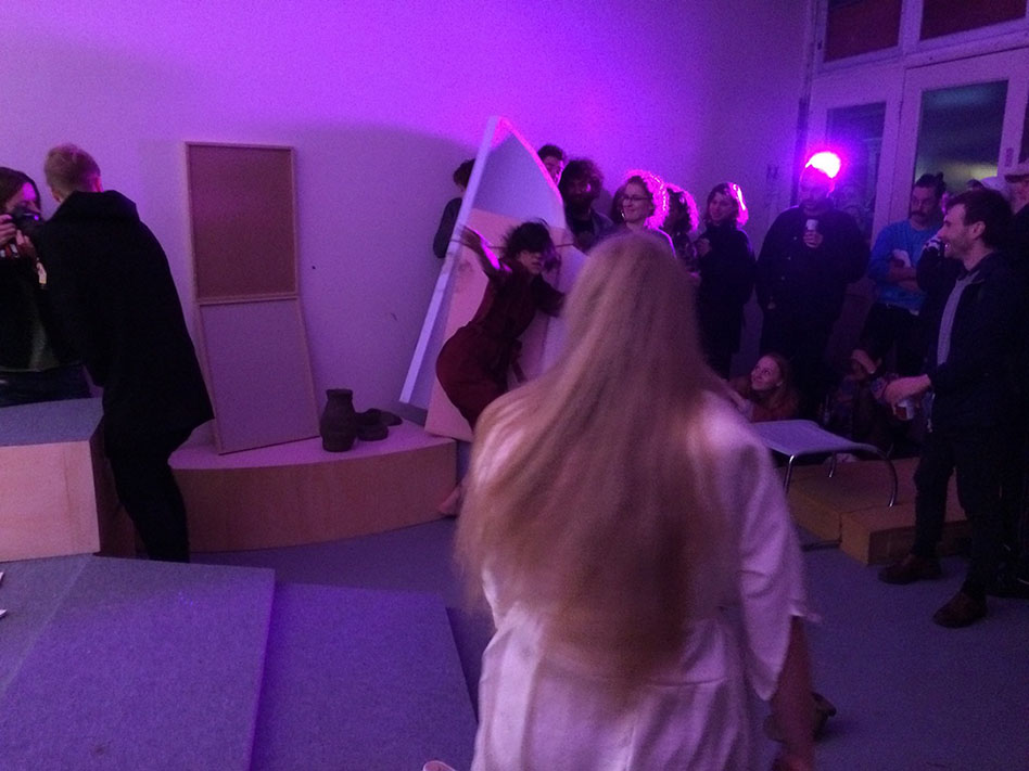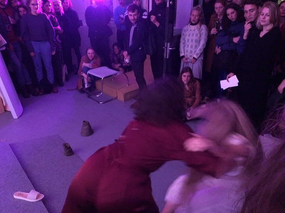 Well Now, it Looks as if You are Armed for Battle is a performance and installation where two performers portray violently competing women in a feminized domestic setting. The work stems from a research into clichés of female confrontation in film and popular culture, often portraying blondes and brunettes as aggressive rivals clashing within otherwise controlled domestic spaces. A vocabulary of the catfight was developed for the piece, including actions like scratching, hair-pulling, and vase-throwing. These acts were transformed into a choreography that relies on the trust and collaboration between the performers as they navigate the space together. The installation incorporates theatrical stunts and objects like sugar-glass vases, allowing viewers to experience it as two distinct environments—before and after being activated by the performance. Rietveld Academie Graduation Show, Amsterdam (NL), spring 2015 Castrum Peregrini, Selected - Best of Graduates group show, Amsterdam (NL), fall 2015 Charlottenborg Kunsthal Spring exhibition, Copenhagen (DK) Spring 2016 Kindly supported by de Berlagde Fund Documentation: Omri Bigetz and Florian Joahn
