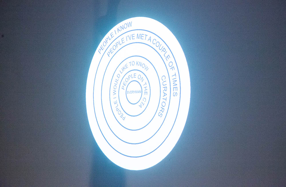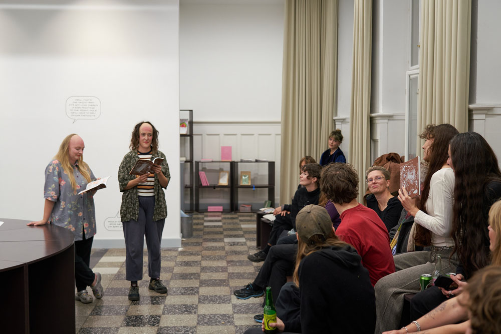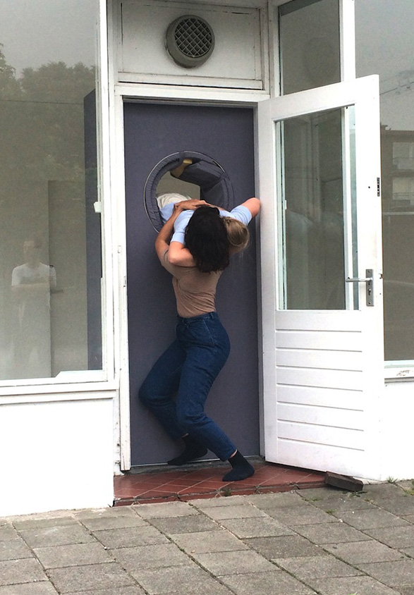 …I’m so scared in case I fall off my chair And I’m wondering how I’ll get down the stairs Clowns to the left of me Jokers to the right Here I am, stuck in the middle with you Yes, I’m stuck in the middle with you A wall divides an indoor gallery space from an outdoor area. The wall features a round hole, about hip-width, positioned too high for easy climbing. One performer stands inside the gallery, while the other is outside. A lo-fi cover version of Steeler Wheeler’s “Stuck in the Middle with You” begins to play. The performers meet at the hole. They assist each other, with one climbing through the hole as the other helps from the opposite side. By the end of the song, they have traded places—one now inside, the other outside. The process repeats every time the song plays, continuing for approximately three hours. The Bookstore space, Amsterdam (NL), 2016