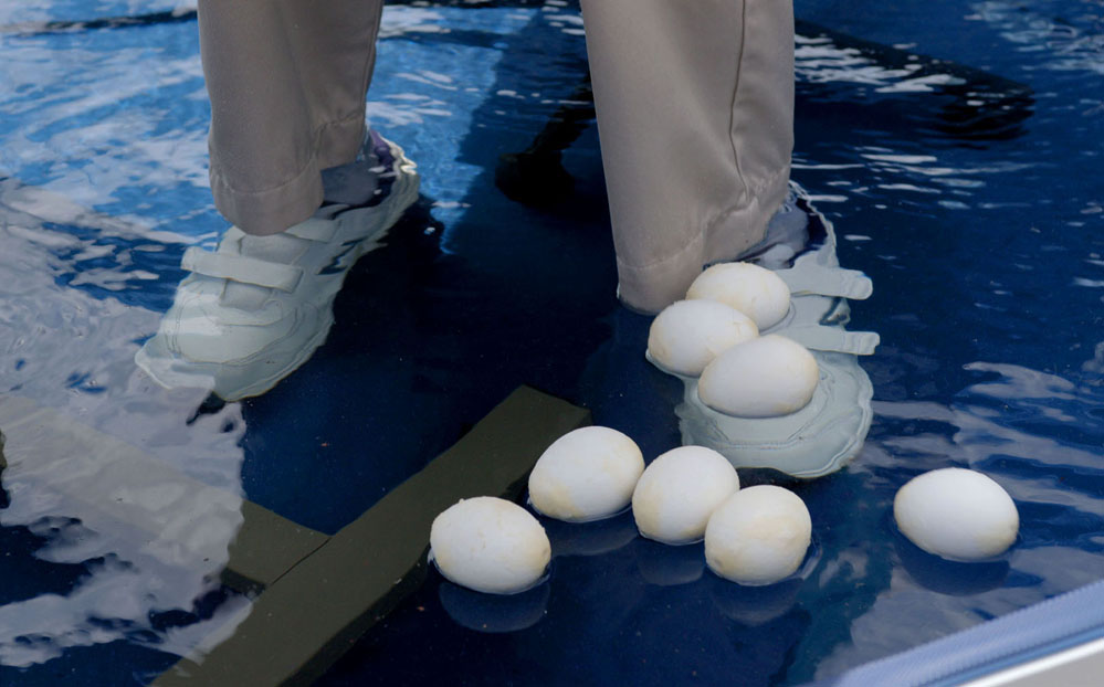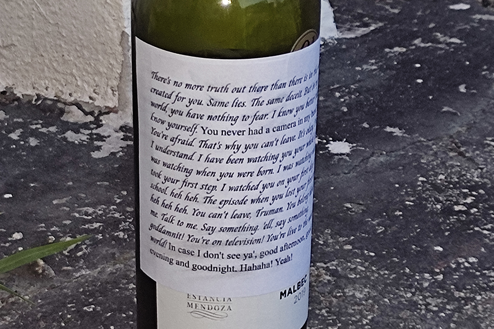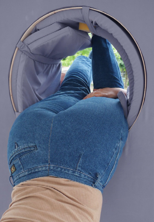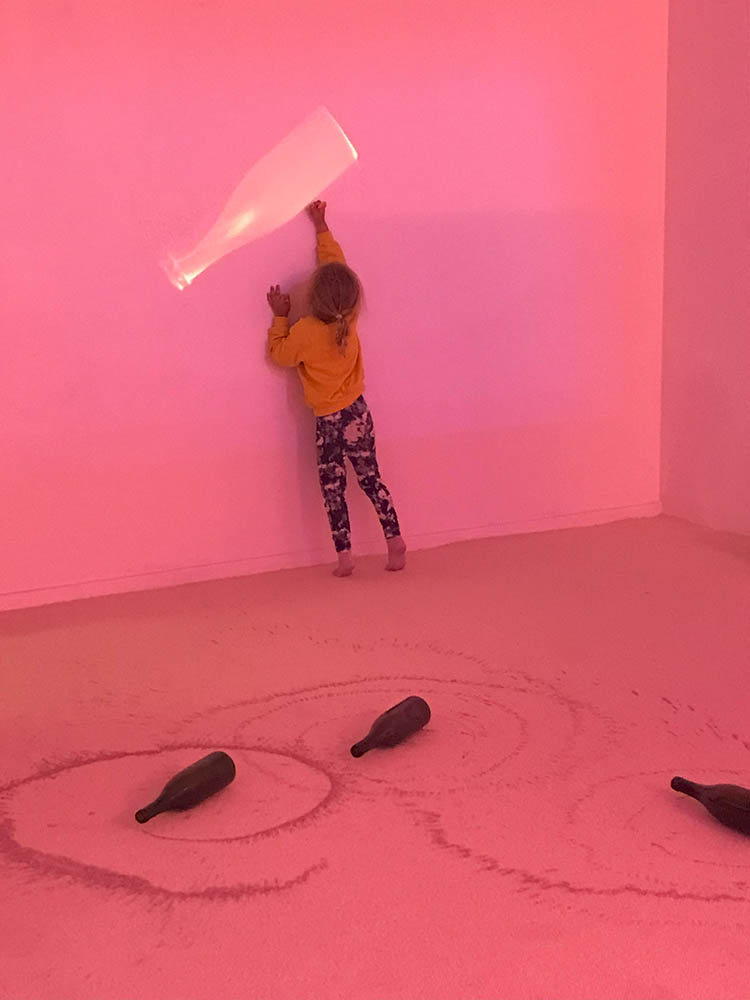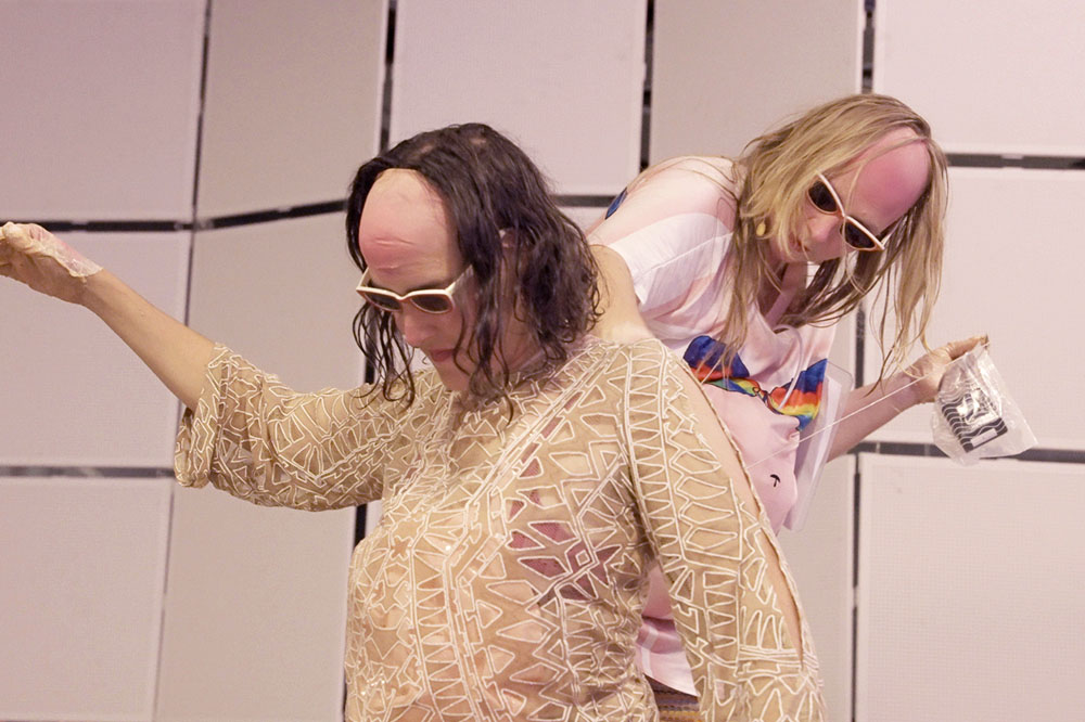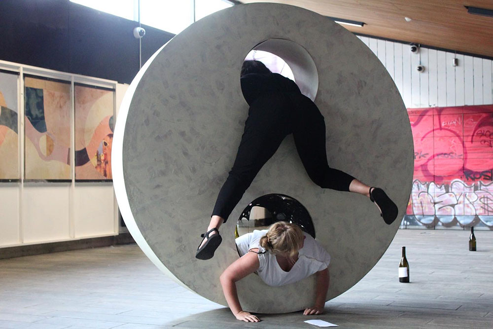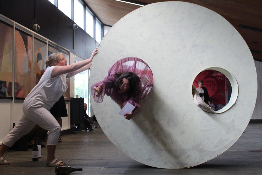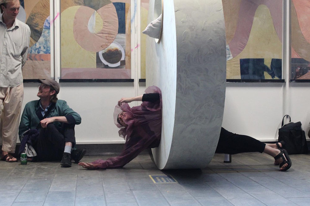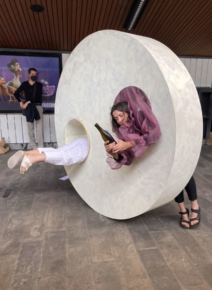 The audience is invited to participate in a game of spin the bottle. The performance starts by spinning the first bottle, this bottle will point to another bottle. The text on the bottle prompts the two performers to reenact various pop cultural scenes of characters stuck in holes, passing through doors or portals, often by chance the same scene is reenacted several times. For the exhibition “The Yes and No of All Things” at Udstillingsstedet Sydhavn Station. The performers would perform the reenactments within the holes of a big wheel resulting in a goofy embodiment of yin and yang in chaotic motion. as part of the performance they would Pass through the holes and move the rolling wall around the space with the collaborative force of their bodies. In later versions, the rolling wall has also been replaced with site specific objects and spaces such as an automatic garage door, a car window or a large trash can. Udstillingsstedet Sydhavn station, Copenhagen (DK), August 2021 Gallery Dimensions Variable, Miami (US), March 2022 Masnedø Sommerudstilling, Vordingborg (DK) Summer 2022 Kindly supported by the Danish arts foundation and Københavns Kommune