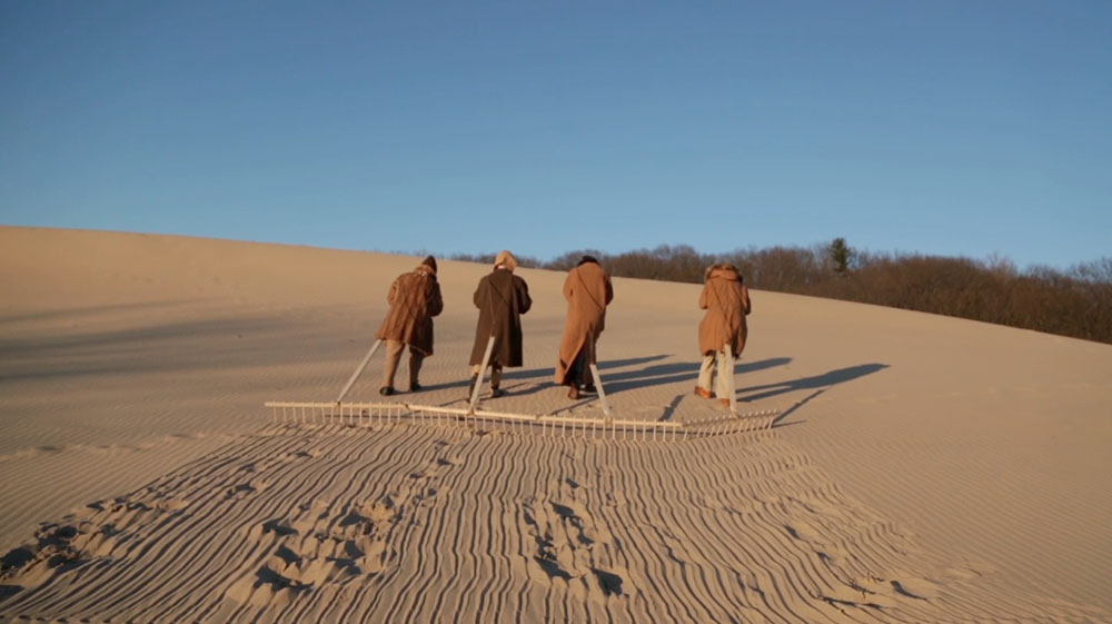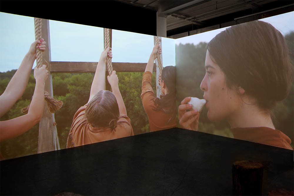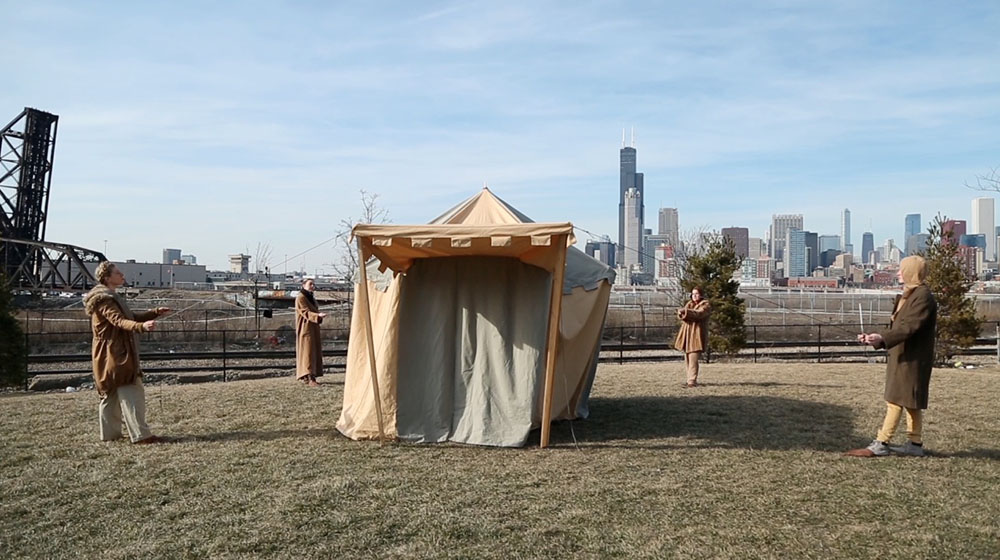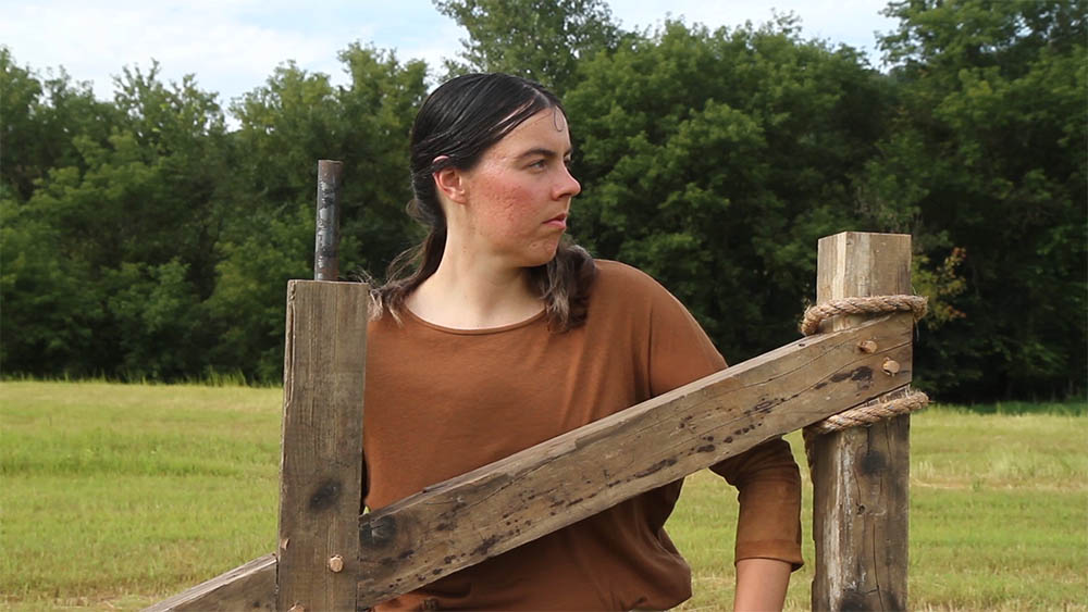 This project is a series of performative films that trace a line from the past to the current political landscape, examining the transition from feudalism to capitalism. The films explore and challenge notions of reenactment, historical accuracy, and the complexities of celebrating, glamorizing, or erasing past narratives. By queering time, the project moves beyond the westernized binaries of the Old World and New World, proposing an alternate other World. The films can be shown as a two channel installation where they exist together in one single edit or they can be viewed as a series of three films. The initial installation was accompanied by a live performance interacting with the two channel video installation. The films are all shot on location in Wisconsin, Illinois and Michigan. Featuring: Coley Mixan, Hannah Patterson, Nanna Rosenfeldt, Angeliki Chaido Tsoli, Lauren Steinberg and Marie Ségolene, Maryam Faridani, Marcella E. Torres, Li Ming Hu and Kellie Wyatt. Installation, School of the Art Institute of Chicago, MFA thesis exhibition, Sullivan Galleries, Chicago (IL), 2018 Screening of “Under Siege”. Image 00:03 Biannual Film festival, Lithium Gallery, Chicago (US) 2018 Screening, Before Sunrise X Galerie Quinconce at Cinéma La Cane, Mont-Fort-sur-Meu (FR), 2020 Screening of “Under Siege” Nuit blanche at la MABA in Nogent Sur Marne (FR), 2022