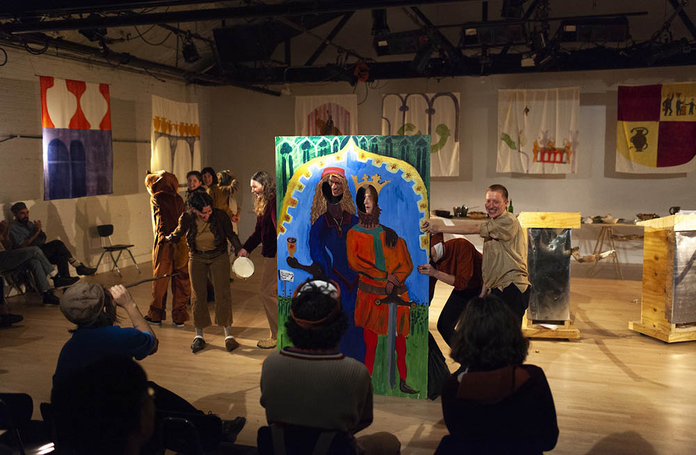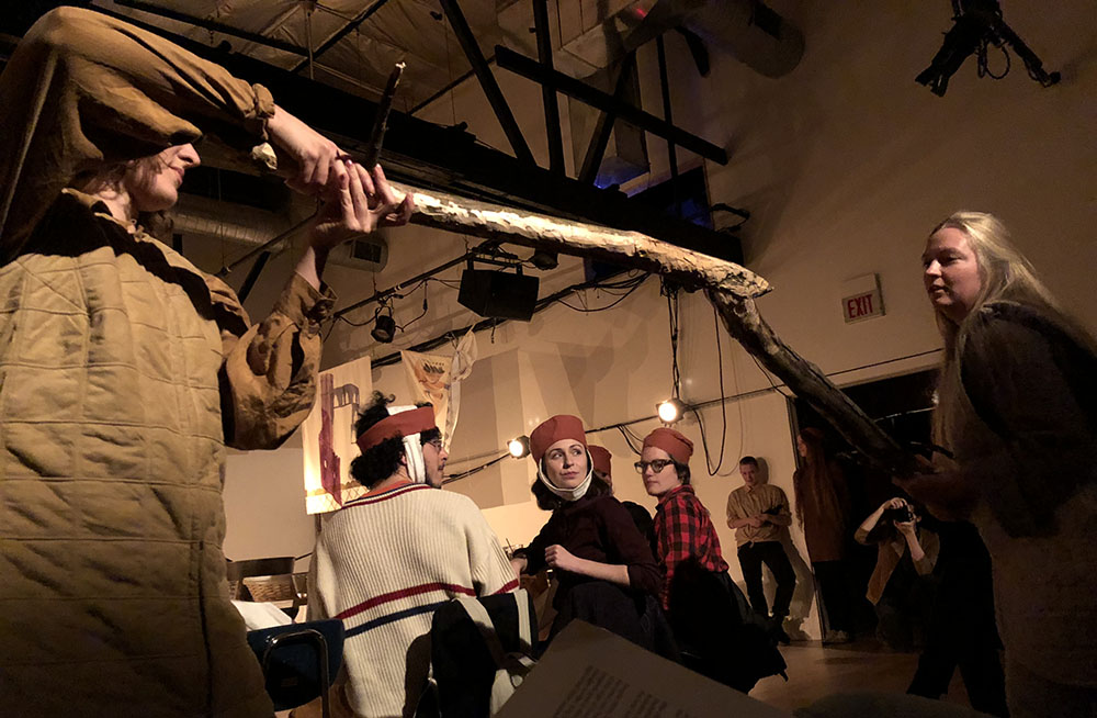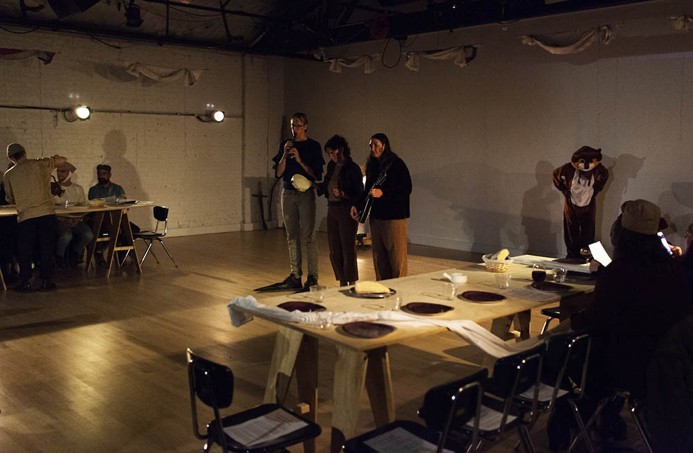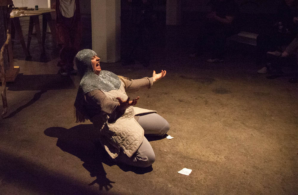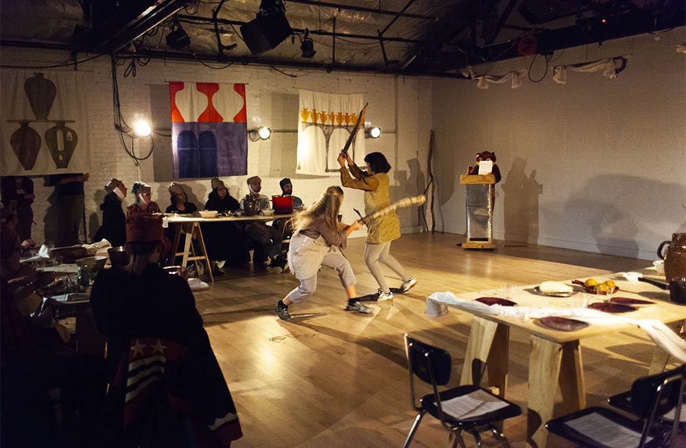 “Your presence is requested at the Everyman Feast and Tournament. You and Everyman are summoned to a Feast and Tournament guaranteed to satisfy all the senses. Come fill your belly, quench your thirst, and have yourself entertained as the stage is set for an evening of heroic jousts in numerous disciplines. Let yourself journey to another time as the troubadour whisks you away on a musical voyage with a voice so smooth your challenged digestion will mirror it. Further immerse yourself with the purchase of transformative one-of-a-kind wares offered at the gate house. These proceedings promise a unique and thrilling performance blurring the boundaries between mundane and spectacular.” Knight from within: Mie Frederikke Fischer Christensen Knight from without: Margaux Parillaud Squire: Lauren Steinberg Squirrel: Maryam Faridani Troubadours: Bennett Van Hoff, Skye Fort and Kellie Wyatt Exhibition text: Kristi Mcguire (text link) Links Hall, Chicago (IL), 2018 Defibrillator gallery of performance art, Chicago (IL), 2018