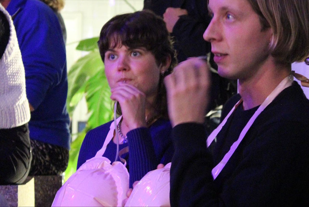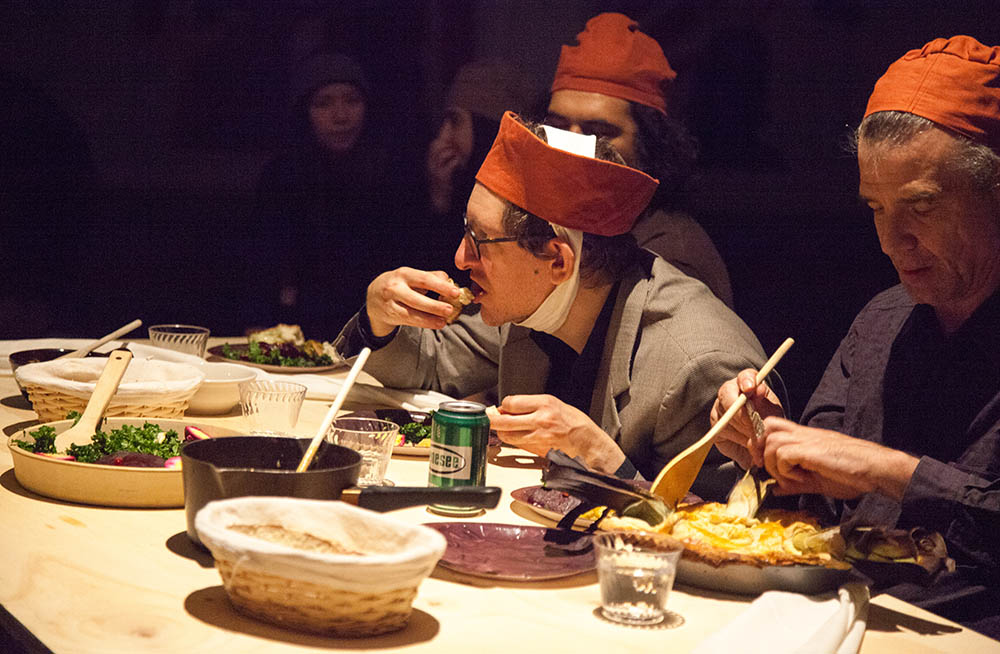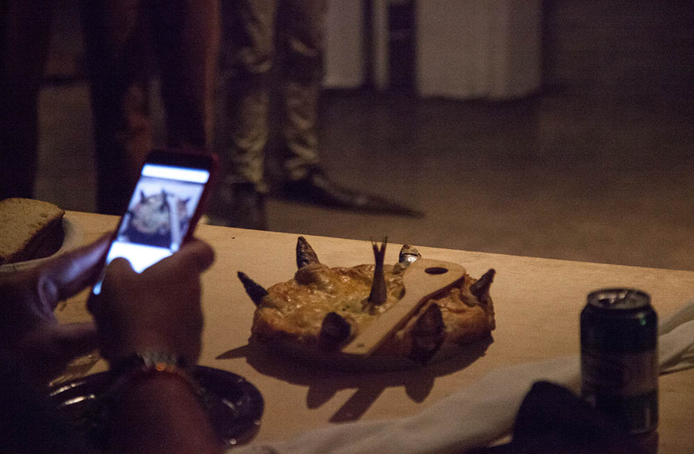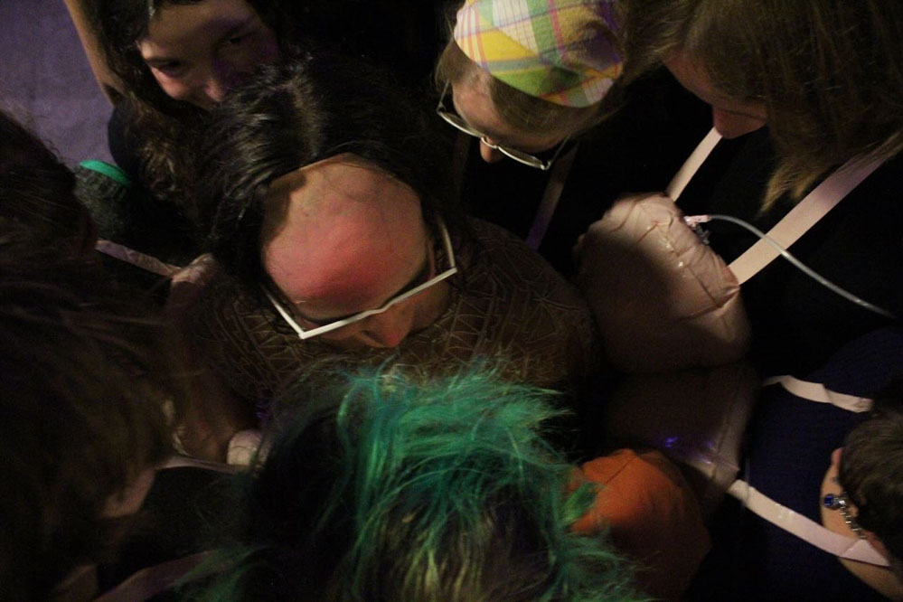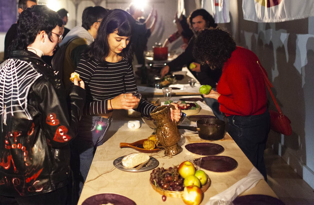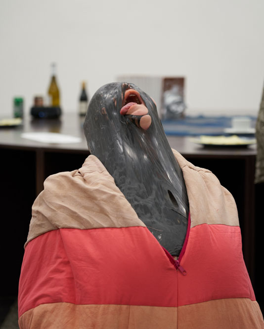 “Your presence is requested at the Everyman Feast and Tournament. You and Everyman are summoned to a Feast and Tournament guaranteed to satisfy all the senses. Come fill your belly, quench your thirst, and have yourself entertained as the stage is set for an evening of heroic jousts in numerous disciplines. Let yourself journey to another time as the troubadour whisks you away on a musical voyage with a voice so smooth your challenged digestion will mirror it. Further immerse yourself with the purchase of transformative one-of-a-kind wares offered at the gate house. These proceedings promise a unique and thrilling performance blurring the boundaries between mundane and spectacular.” Knight from within: Mie Frederikke Fischer Christensen Knight from without: Margaux Parillaud Squire: Lauren Steinberg Squirrel: Maryam Faridani Troubadours: Bennett Van Hoff, Skye Fort and Kellie Wyatt Exhibition text: Kristi Mcguire (text link) Links Hall, Chicago (IL), 2018 Defibrillator gallery of performance art, Chicago (IL), 2018