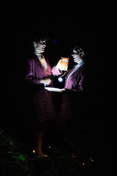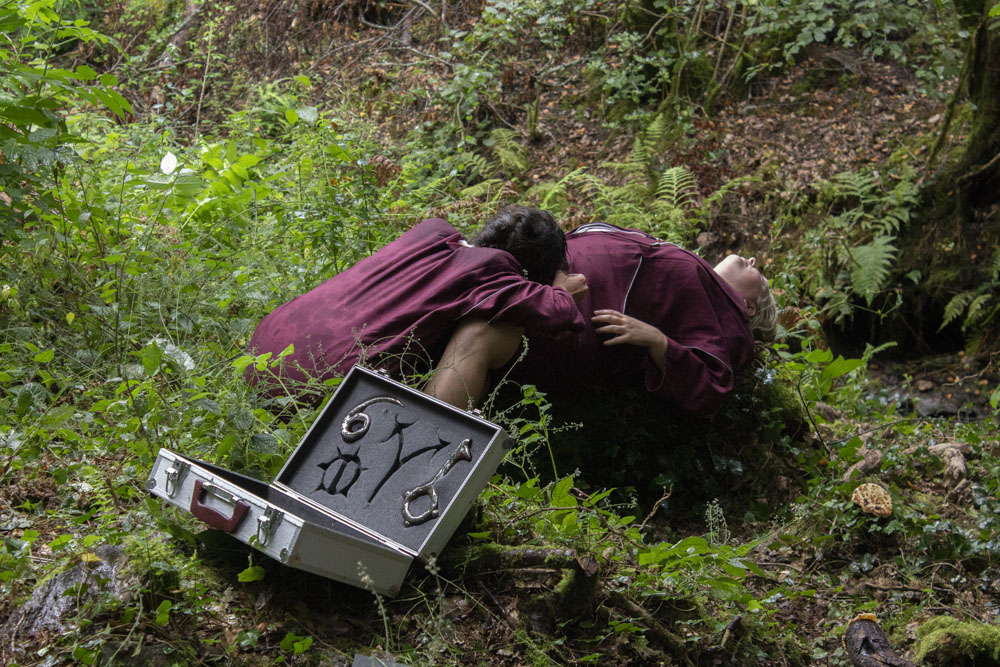 If you’re lost, you can look and you will find me Time after time If you fall, I will catch you, I will be waiting Time after time time after... TIME is glowing in the Dark like a potentially extraterrestrial fungi infesting the western broadleaf and mixed forests. The trees are showing signs of lost time. The rings that used to indicate the past year are disappearing making room for a weird growth of brown boils on a surface of spongy skin. Time is glowing in the dark, like the woman and her colleague that has arrived to investigate and retrieve the circle, the passing and the power of two. There is much to be learned from the power of two, there is much to be learned from the power of two. Say it once, say it twice, count the clock-wise, pregnancy is nice! A woman and her colleague arrive from another dimension to investigate an alien fungus infesting the local ecology. From here an absurd narrative evolves, touching on collaboration, epidemics and conspiracy theories, across time and space. Kolonien (København DK) 2019 Setu festival Rennes (FR) 2019 Overgaden, performance festival Resonance and Wonder, København (DK) 2021 Revue Phylactère, Performance event, CAC Chanot, Clamart (FR) June 2021 Kindly supported by The danish arts foundation Documentation by Thomas Portier, Clément Harpillard and Bennett Van Hoff