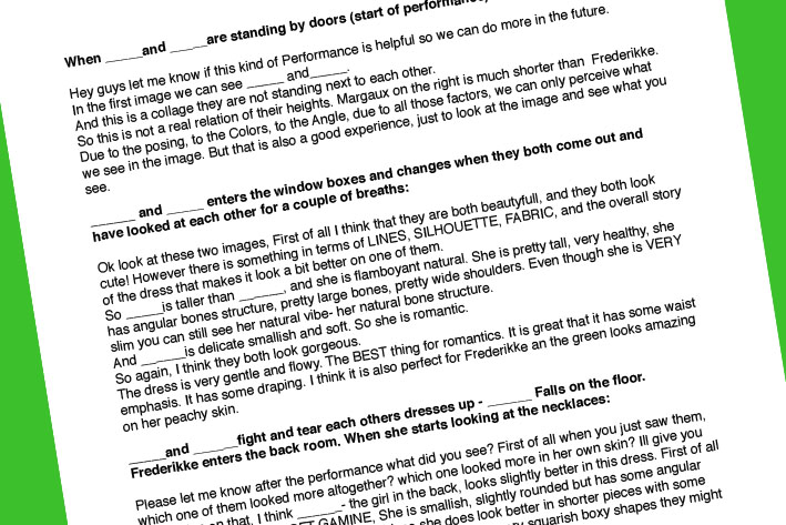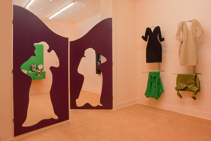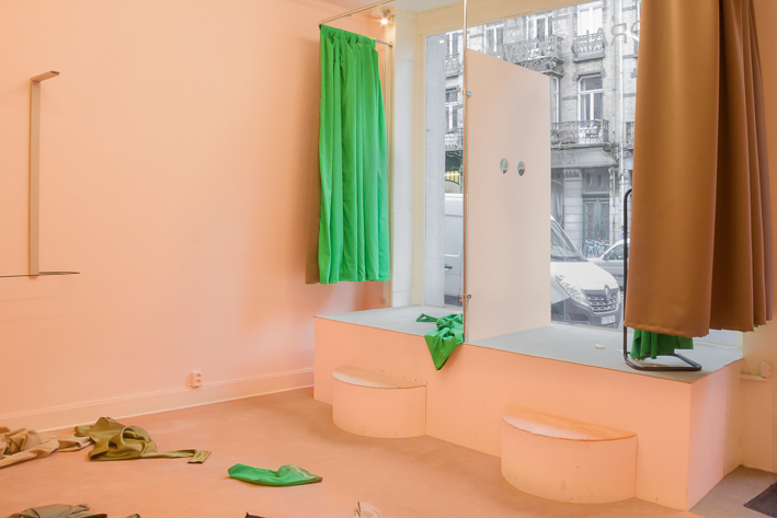 When asked to decide “who wore it better”. Do we collectively sew a stitch in a dress that does not fit for any of us?. Imitating a retail environment, the installation sets up a mirroring game, where the visitor is asked to reflect upon the balance between individual and collective, in the construction of the “fitting room”. The space is activated in the performance, where two women, portrayed as a blonde and a brunette, pass dresses and jewelry between them in acts of shifting kindness and maleficence. The chaos they leave behind becomes part of the installation. Deborah Bowmann Gallery, Bruxelles (BE), 2019 Documentation by Victor Delestre and Amaury Daurel