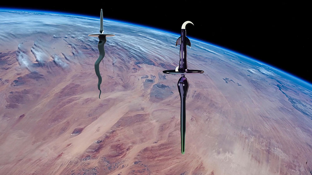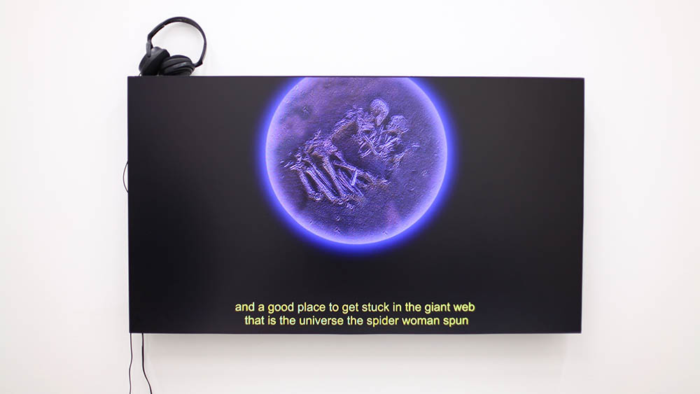 The Yes and No of All things Mixed media video installation, 3D animated video, 16-minute loop. Poster Frieze: 16 posters 120/80: Natural dyed cotton, cyanotype, print on canvas and reflective textile. 2021 video link