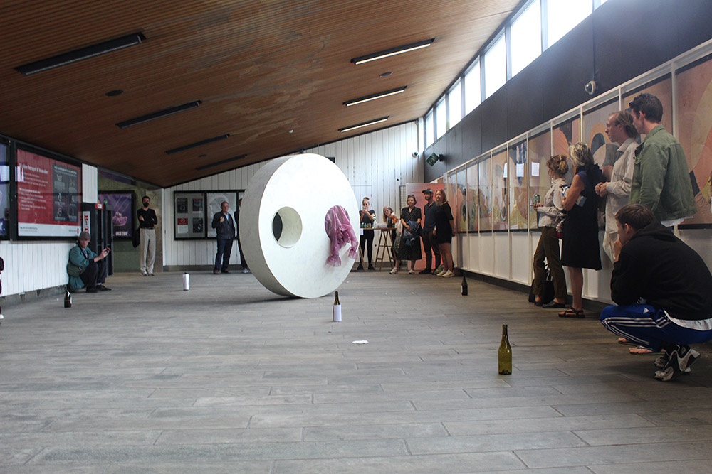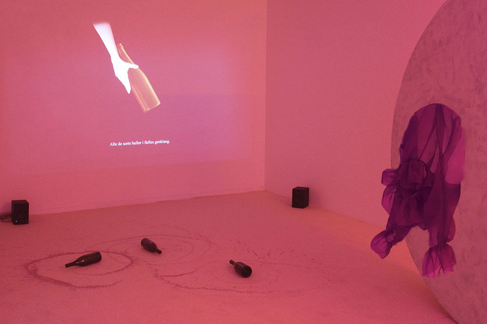 It starts with a spin. It starts with a turn. And when you watch it spin, it comes full circle. Why don’t you watch it? You have to watch it! The Yes and No of all things. Life’s movement. The clash, you - me and it. Is it a threesome? Nature reveals itself to itself. Another hole is filled and the magic hour is compared to a fingernail clipping. This body of work is inspired by the collective experience of grand natural phenomena. On one side there is the euphoria of being present in the moment, bearing witness to the heartbeat of the universe. On the flipside, we face global challenges such as climate change and the covid pandemic. Events that have profoundly shifted our collective consciousness. Confronting nature’s cycles, both grand and small, evokes feelings of euphoric joy alongside sorrow and helplessness—the yes and no of all things. Perhaps, within the space of transformation, we can initiate a new spin in the cycle. In the main exhibition space, visitors encounter a video installation with large and small sculptural elements. The room, softly lit, includes a video projection of a 3D animated game of "spin the bottle," accompanied by a narrative soundscape played through speakers. A large round wall with two circular holes, just big enough to crawl through is also part of the installation. This element is activated in a performance during the exhibition. In the smaller room, visitors can view the video piece Décalage, which documents the collective euphoria during the 2017 solar eclipse - a central departure point of the exhibition. Outside the exhibition space itself, a long snake weaves through the poster holders in the entrance hall. In mythology, the snake symbolizes time, both linear and cyclical, and is also tied to the legend of the solar eclipse, where the snake swallows the sun, plunging the world into darkness. In this work, the snake becomes part of the fabric’s texture, winding through foreground and background, serving as a kind of calendar that maps the sun and planets' influence on our lives. Udstillingsstedet Sydhavn station, Copenhagen (DK), 2021 Kindly supported by the Danish arts foundation and Københavns Kommune Documentation: Bennett Van Hoff