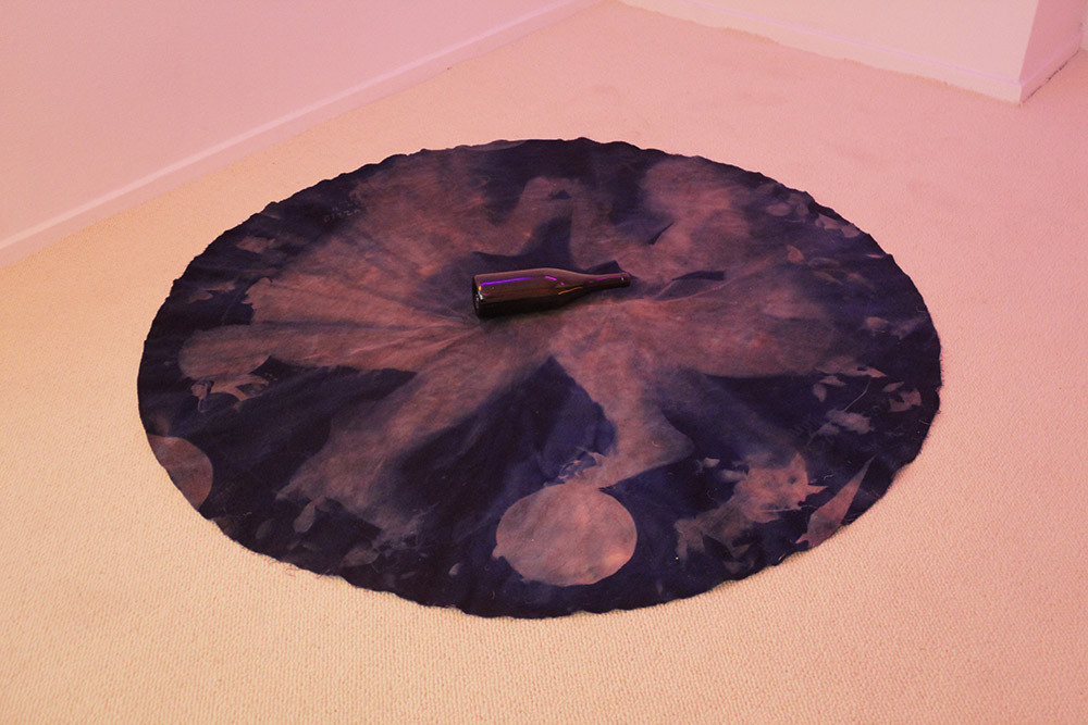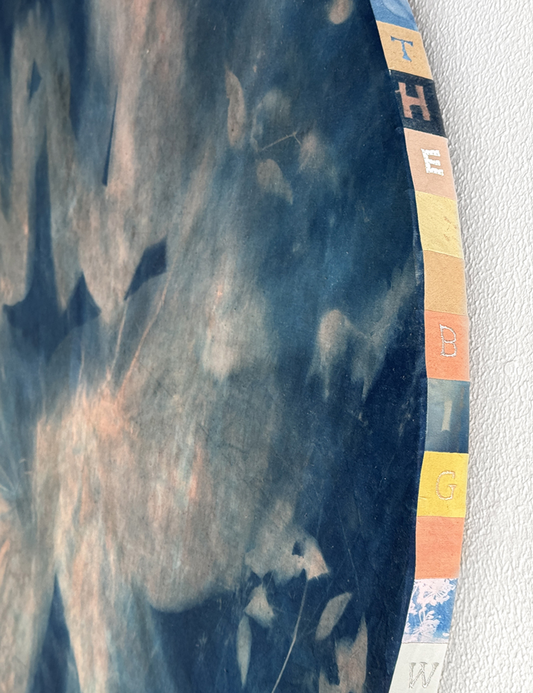 Like a Big Pizza Pie Round wall piece with spinning mechanism, 150 diameter Cyanotype, textiles and sound. 2025 listen to Like a Big Pizza Pie