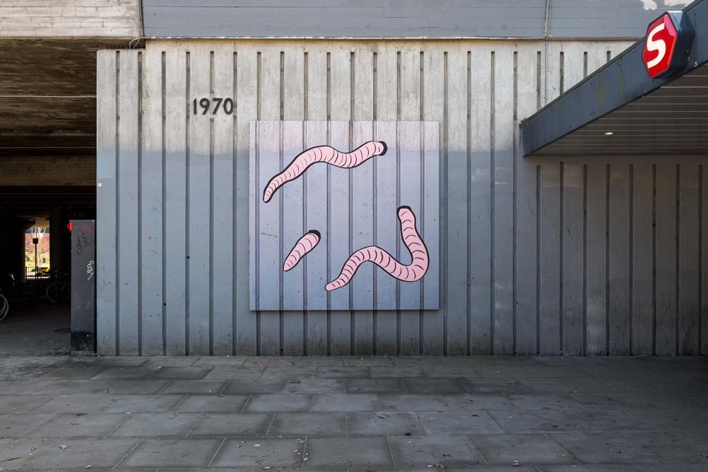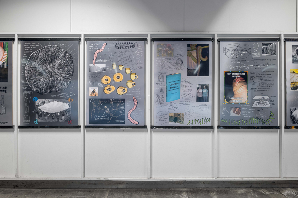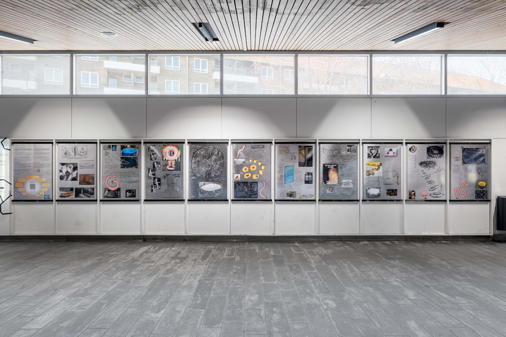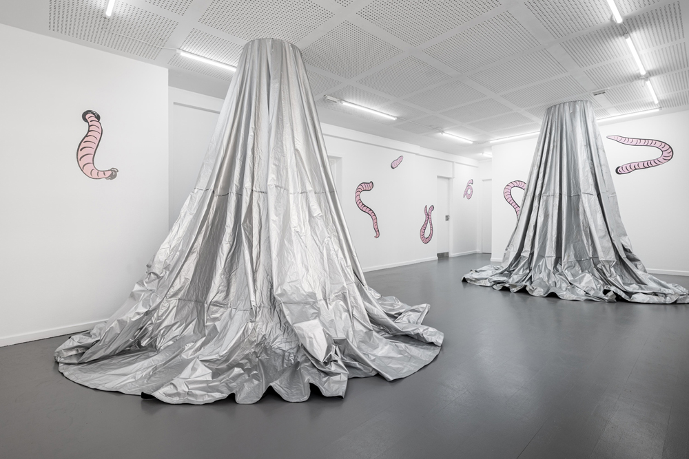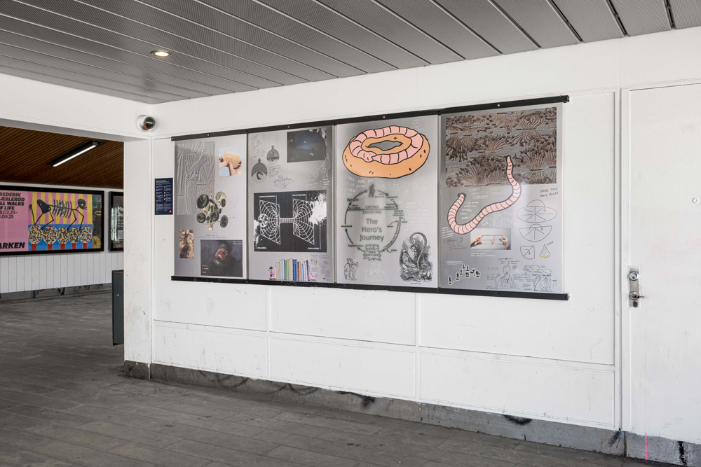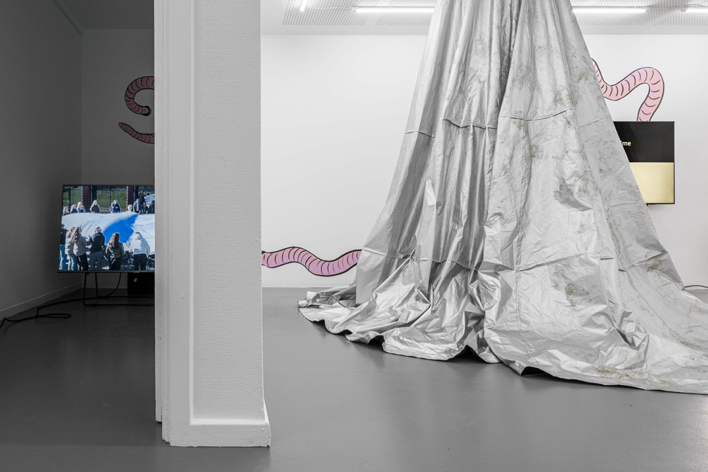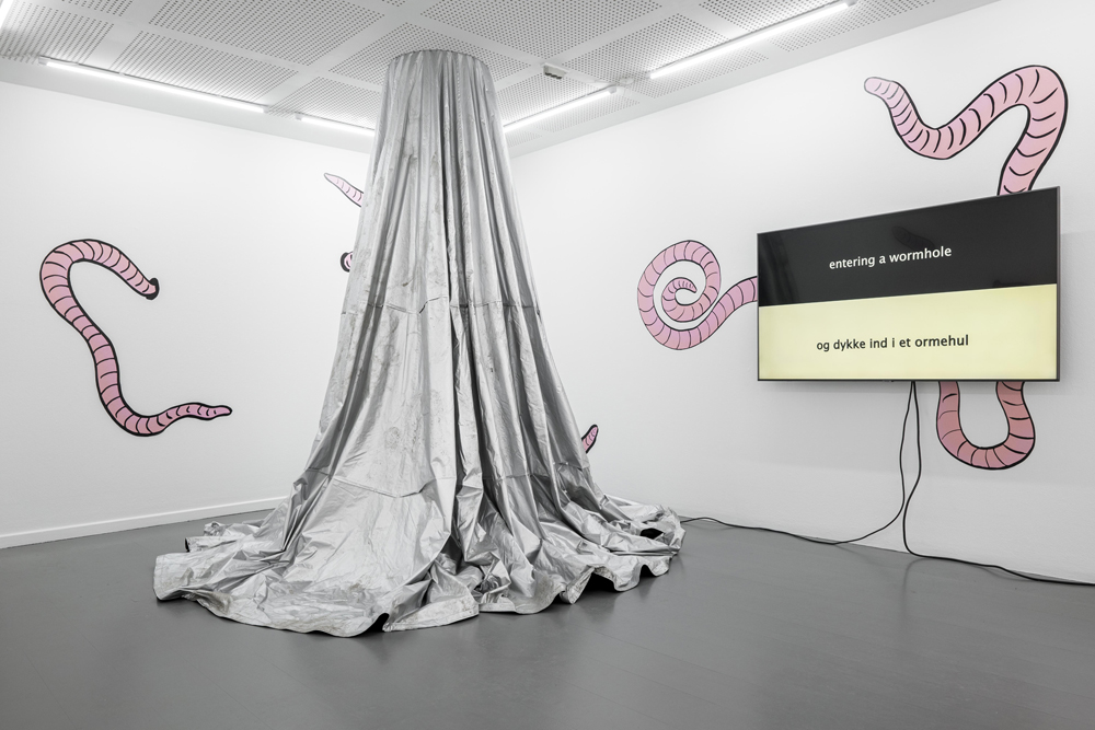 Wormtime invites viewers to explore the concepts of wormholes, time travel, and parallel universes, offering a detour through the cosmos toward new perspectives and possible realities. Blending science fiction with scientific theories about alternate dimensions, the exhibition challenges the individual's perception of reality. A billboard featuring comically oversized earthworms bursting from the concrete walls sets the tone. Inside the exhibition space, the invasion continues: worms crawl across the walls, disappearing into and emerging from holes in the surfaces — literal wormholes. At the center of the room, two sculptures made of reflective textile appear to pierce through the ceiling, suggesting portals to another time or space. They invite the viewer to enter or follow — though it remains unclear where they might lead. These visual elements form the backdrop for the sound piece A Journey Through Wormtime, which plays in the space alongside a screen displaying the accompanying text. This meditative work takes visitors on a sonic journey through the wormhole and into the realm of wormtime. The textile sculptures are also activated in the performance The Relation Ship, where the sculpture expands into a space for collective play and storytelling. Through a shared choreography, participants are guided through wormtime, transforming the sculpture into anything from gravitational waves or black holes to a wormhole or even a donut-shaped universe. Participation is central to the work: the audience co-creates the experience, becoming part of a larger whole. Each iteration of The Relation Ship builds on the last, weaving participants’ contributions into future choreographies. The result is an expanding universe of movement and co-creation. A documented version of the performance created in collaboration with students from Nørre Gymnasium is on display in the exhibition space. In the station foyer, a Brainworm composed of 15 posters presents a collage of drawings, found images, photographs, and hand applied notes. This visual research archive offers insight into the thought processes behind both the performance and the exhibition as a whole. Wormtime draws on pop cultural phenomena such as the multiverse, as well as philosophical theories like metaphysics and modal realism. In a world where reality expands in all directions, yet the individual’s universe seems to shrink, the exhibition remediates these ideas in a tactile, playful way — creating a wormhole between the intangible and the down-to-earth. Funded by Københavns kommune - Rådet for Visuel Kunst and the Danish Arts Council. Poul Johansen fonden and Aage and Johanne Louis-Hansen Fond have funded the billboard and the posters in the lobby. Thanks to Titta Sioni who narrates the worm-meditation, Robin Poligné for the meditative soundscape and to the students at Nørre gymnasium for playing with us. Review of the exhibition in Atlas Magasin A journey through wormtime Solo exhibition at Udstillingsstedet Sydhavn Station, Copenhagen, 2025 Documentation: Morten Underbjerg