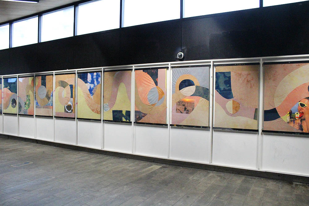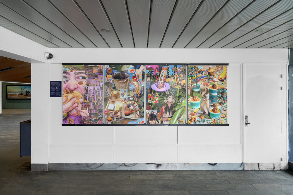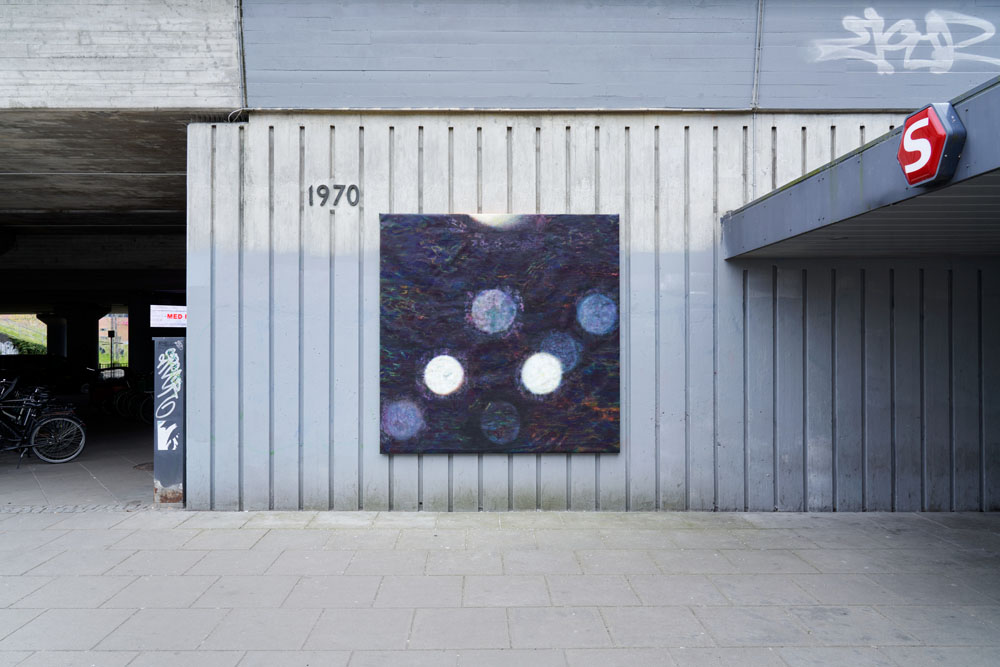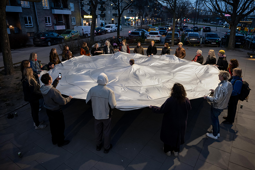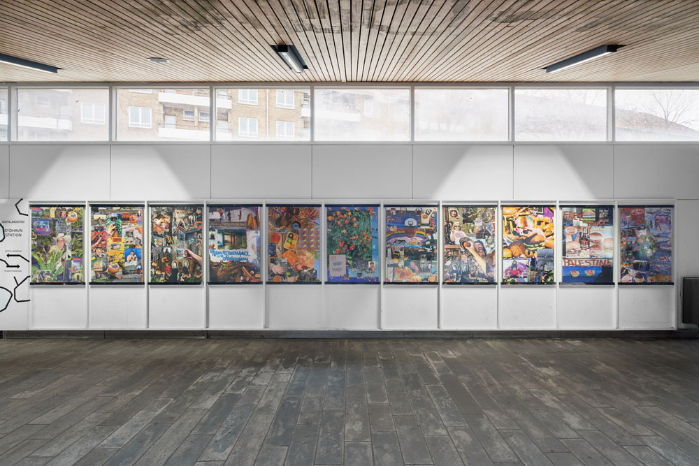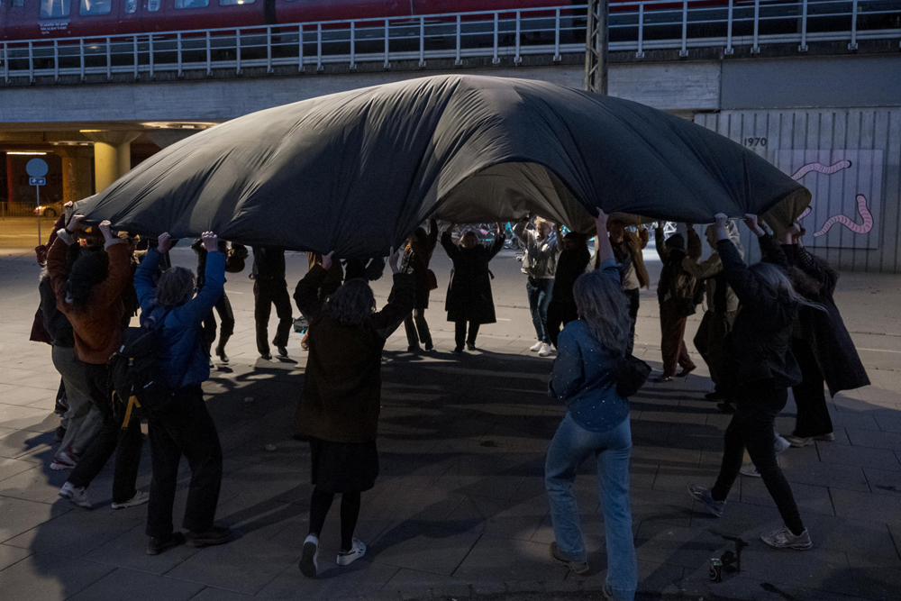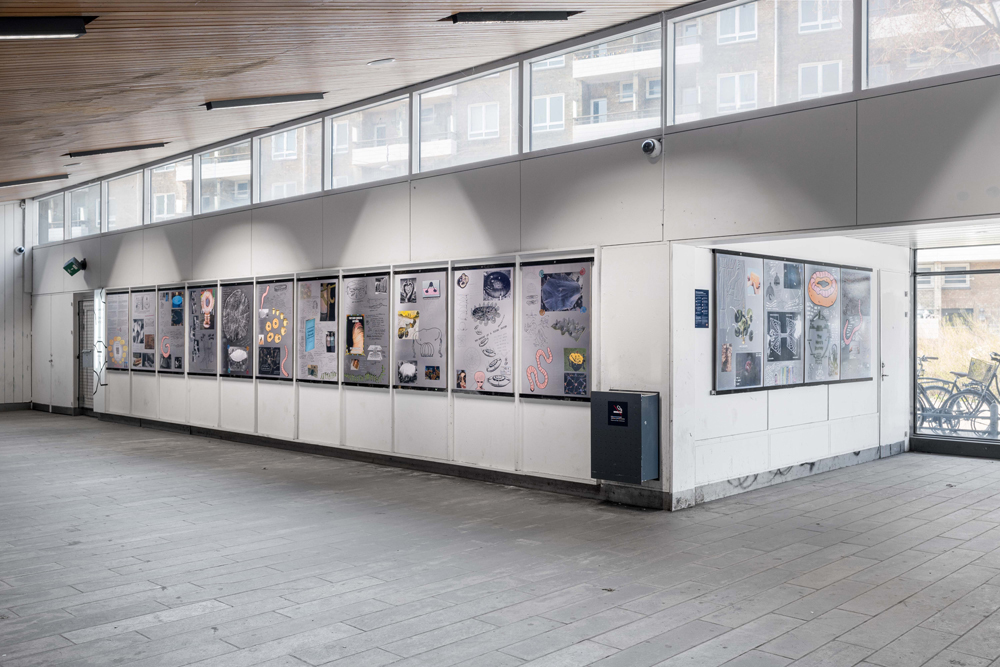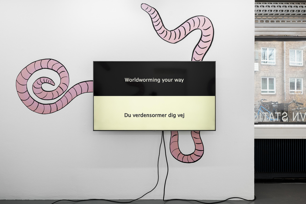 Wormtime invites viewers to explore the concepts of wormholes, time travel, and parallel universes, offering a detour through the cosmos toward new perspectives and possible realities. Blending science fiction with scientific theories about alternate dimensions, the exhibition challenges the individual's perception of reality. A billboard featuring comically oversized earthworms bursting from the concrete walls sets the tone. Inside the exhibition space, the invasion continues: worms crawl across the walls, disappearing into and emerging from holes in the surfaces — literal wormholes. At the center of the room, two sculptures made of reflective textile appear to pierce through the ceiling, suggesting portals to another time or space. They invite the viewer to enter or follow — though it remains unclear where they might lead. These visual elements form the backdrop for the sound piece A Journey Through Wormtime, which plays in the space alongside a screen displaying the accompanying text. This meditative work takes visitors on a sonic journey through the wormhole and into the realm of wormtime. The textile sculptures are also activated in the performance The Relation Ship, where the sculpture expands into a space for collective play and storytelling. Through a shared choreography, participants are guided through wormtime, transforming the sculpture into anything from gravitational waves or black holes to a wormhole or even a donut-shaped universe. Participation is central to the work: the audience co-creates the experience, becoming part of a larger whole. Each iteration of The Relation Ship builds on the last, weaving participants’ contributions into future choreographies. The result is an expanding universe of movement and co-creation. A documented version of the performance created in collaboration with students from Nørre Gymnasium is on display in the exhibition space. In the station foyer, a Brainworm composed of 15 posters presents a collage of drawings, found images, photographs, and hand applied notes. This visual research archive offers insight into the thought processes behind both the performance and the exhibition as a whole. Wormtime draws on pop cultural phenomena such as the multiverse, as well as philosophical theories like metaphysics and modal realism. In a world where reality expands in all directions, yet the individual’s universe seems to shrink, the exhibition remediates these ideas in a tactile, playful way — creating a wormhole between the intangible and the down-to-earth. Funded by Københavns kommune - Rådet for Visuel Kunst and the Danish Arts Council. Poul Johansen fonden and Aage and Johanne Louis-Hansen Fond have funded the billboard and the posters in the lobby. Thanks to Titta Sioni who narrates the worm-meditation, Robin Poligné for the meditative soundscape and to the students at Nørre gymnasium for playing with us. Review of the exhibition in Atlas Magasin A journey through wormtime Solo exhibition at Udstillingsstedet Sydhavn Station, Copenhagen, 2025 Documentation: Morten Underbjerg
