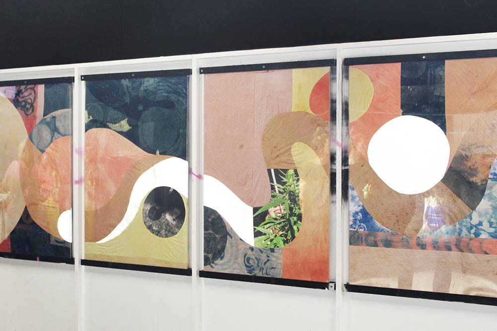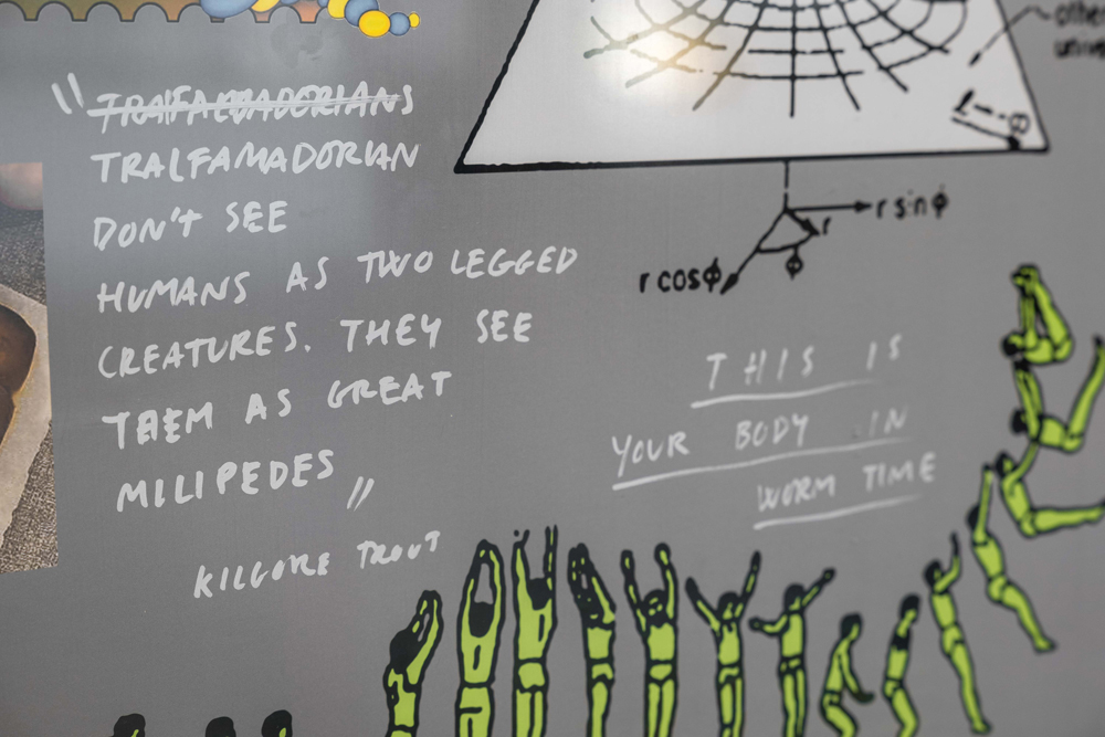 Wormtime Mixed media installation Textile, wall decals, sound and video; 28 min duration. Billboard; photoprint, 240x240cm 16 posters; photoprint and hand applied notes, 120x80cm 2025 listen to A journey through wormtime