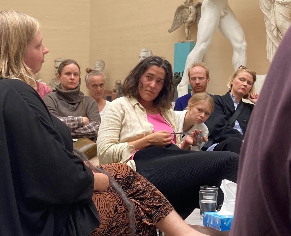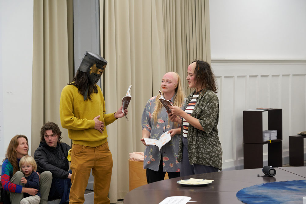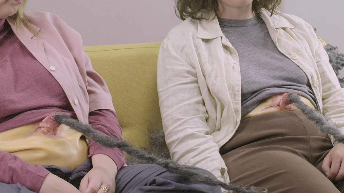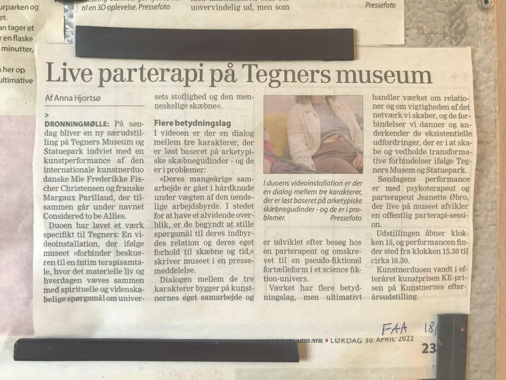A live therapy session with couples therapist Jeannette Øbro The session invited the audience to listen in on a therapy session where Consider to be Allies evaluated the collaborative process leading up to the installation work String therapy. As the session evolves, the artist duo starts pulling wooly threads from their belly buttons. By showing the session publicly we also hope to make couples therapy and relational work more approachable for those on the cusp. Rudolph Tegners Museum og samling, Dronningmølle (DK), 2022 Kindly supported by the Danish Arts Foundation Documentation, Line Gry Hørup