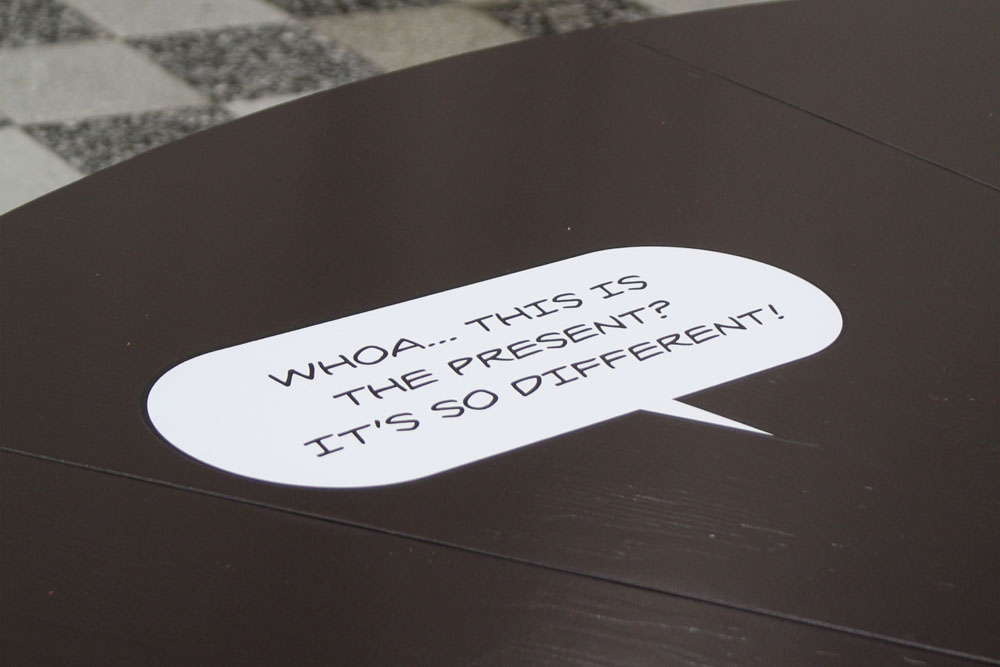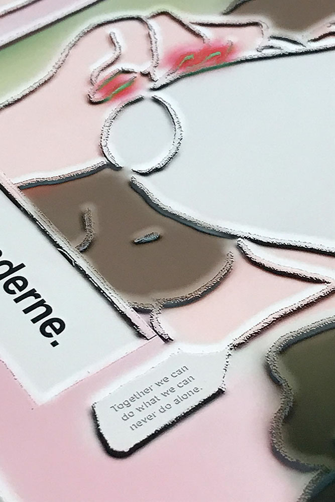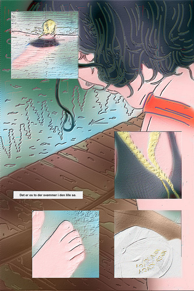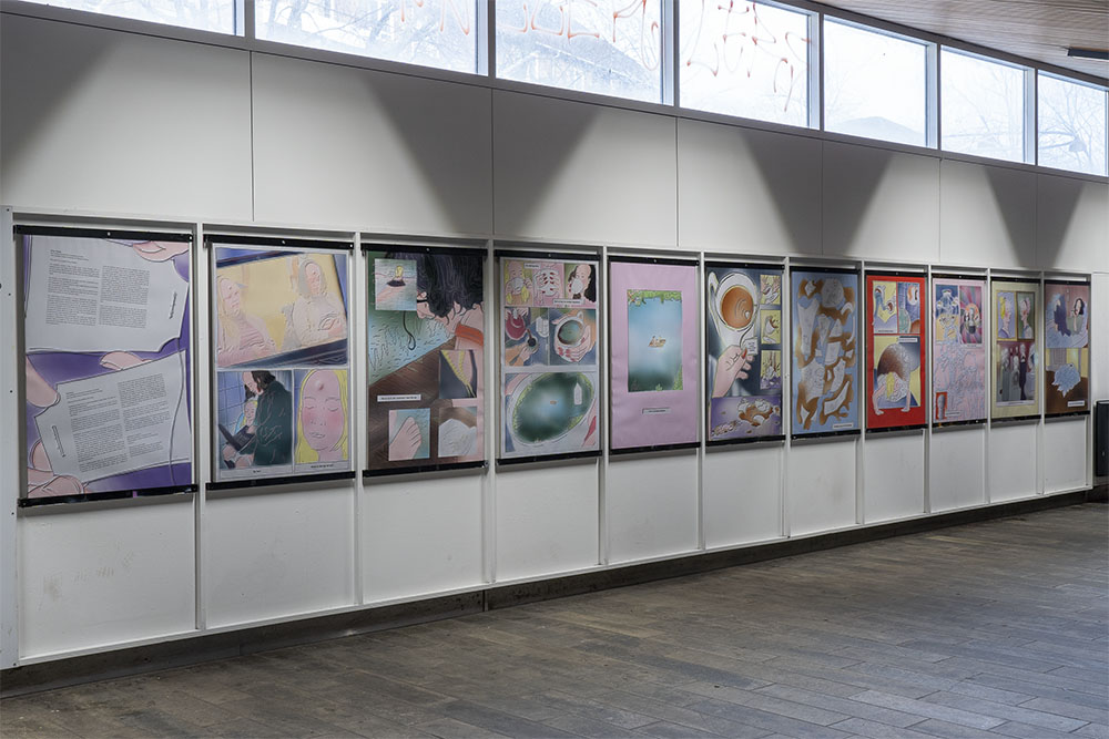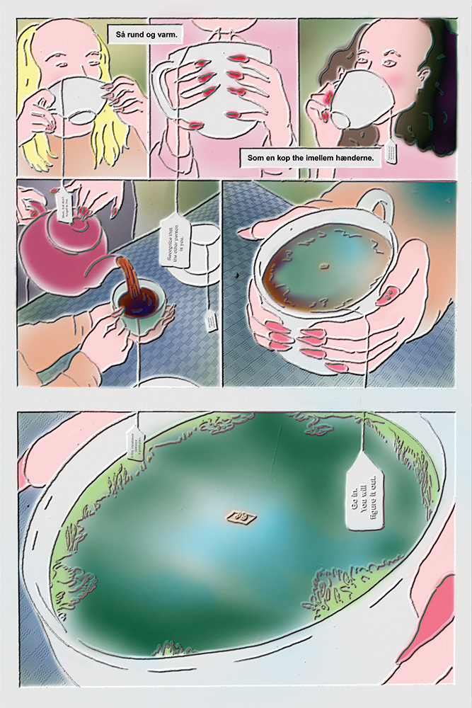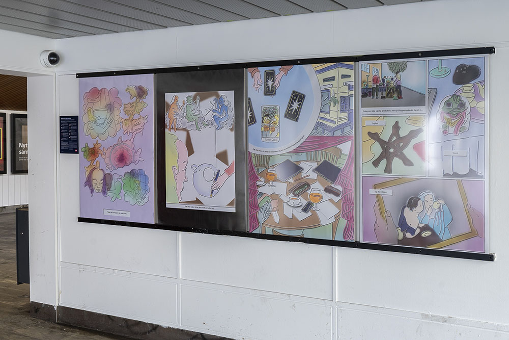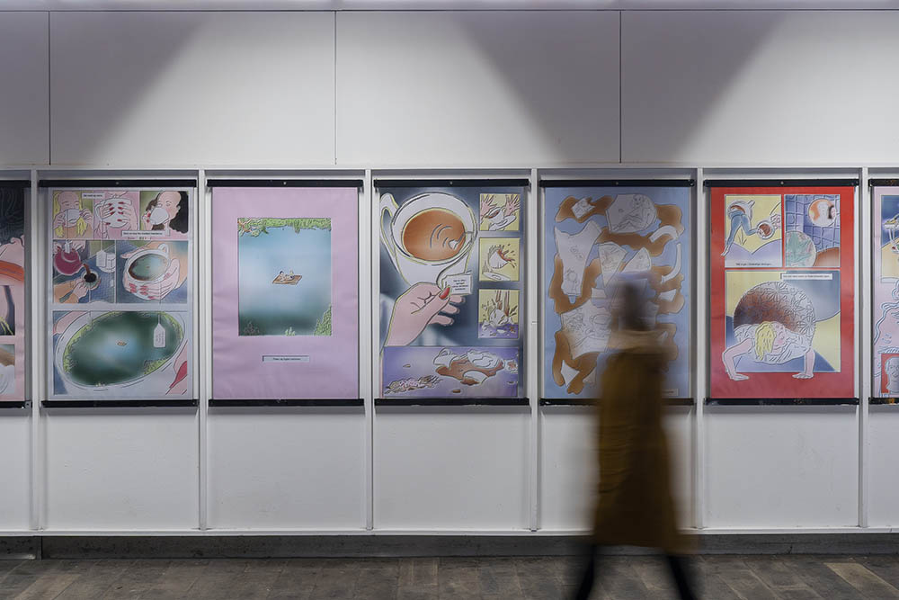 Based on the alter egos we have developed throughout our collaboration, we’ve illustrated a shared universe and the many worlds they navigate. Alongside the characters are recurring motifs of circles, holes, and cups, which subtly resist the linear nature of the comic strip. The piece is also a material experiment in the possibilities and limitations of collaboration. Can two people truly collaborate on drawing? Is it possible to entirely erase individual stylistic traces? Udstillingsstedet Sydhavn Station, Copenhagen (DK), 2023, Juxtapose Art fair, Godsbanerne Aarhus (DK), 2023