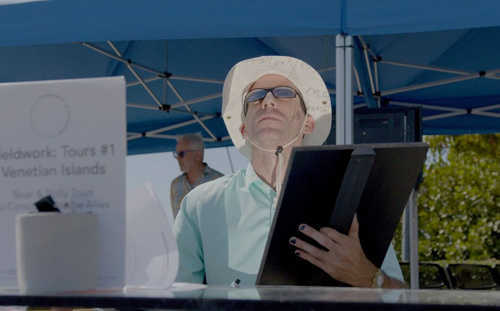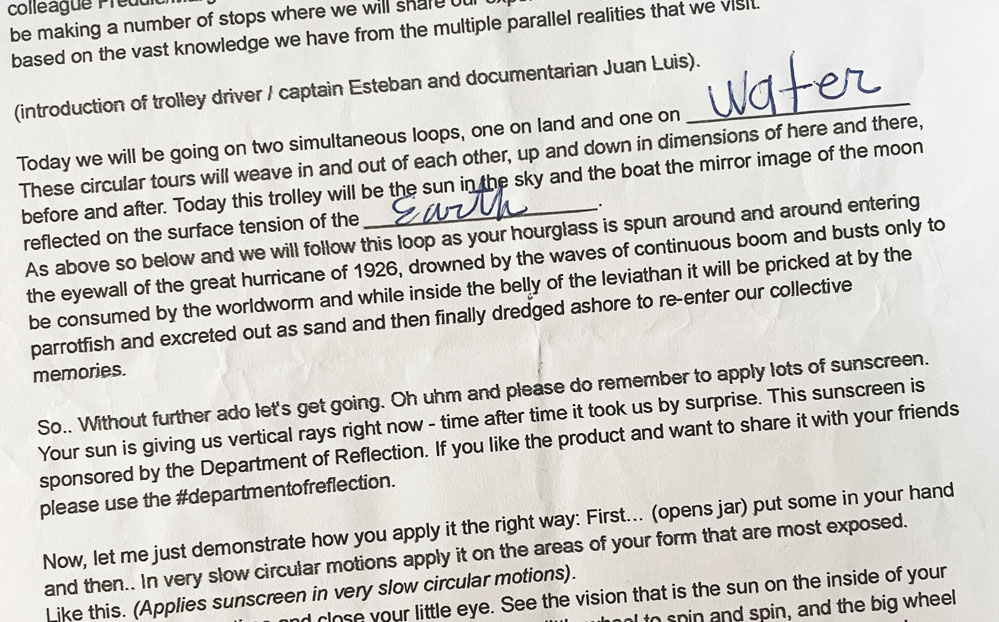 Venetian Islands - Boat & Trolly Tours with Considered to be Allies Including Publicly Submitted Input. Department of Reflection April 9, 2022 2-6pm (tours every 30 minutes) Maurice Gibb Park, Miami Beach For the Department of Reflection's first Fieldwork: Tour we've invited expert outsiders Considered to be Allies to Miami, specifically Miami Beach's Venetian Islands, and asked them to help us investigate the famed millionaire mounds and surrounding waters, including Isola di Lolando, the Venetian Island that never was. Via mirrored tours happening simultaneously, one on a trolley bus and another on a small boat, they will guide participating residents in a hands-on presentation of their findings, including public input collected by DoR. Their Mission: 1. To help us distinguish the past from the present, the present from the future, and the future from the past. 2. To further our understanding of the Venetian Islands as wholly man-made land masses in relation to other man-made things. 3. To remind us of the strengths (and weaknesses) inherent in our hyper-local perspectives. 4. To find the truth, the lies, the truth in lies, and the lies in truths. 5. To facilitate reflection. How You Can Help: 1. Answer the open call for public input (We sincerely thank all those who submitted entries!) 2. Take the tour(s) 3. Turn in your amended script before leaving Reflection Tours, commissioned by the Department of Reflection, Miami Beach (FL), March 2022 This program was made possible with support from the City of Miami Beach and the Danish Arts Foundation. Documentation: Misael Soto and Juan Luis Matos
