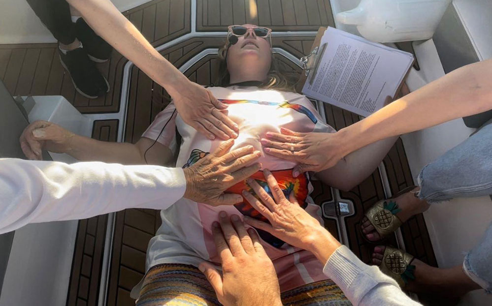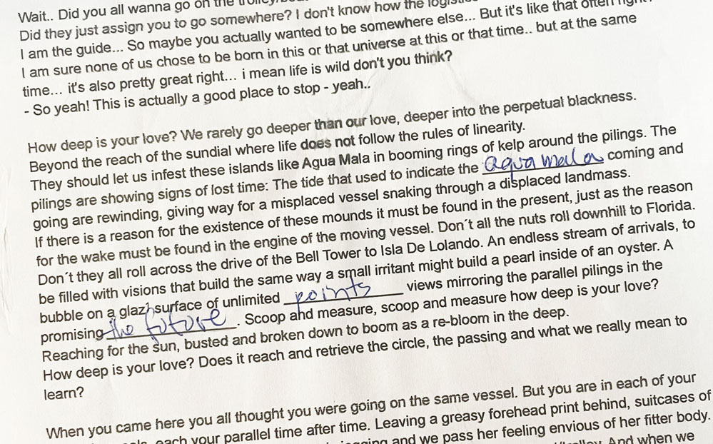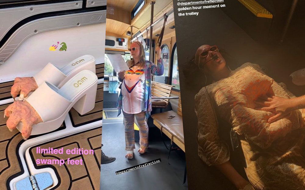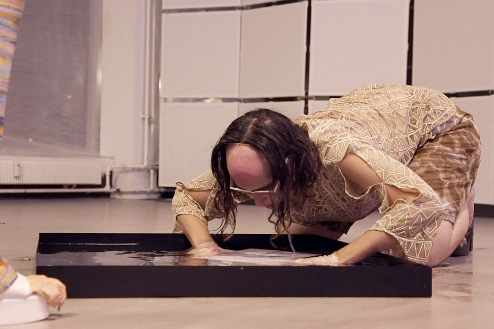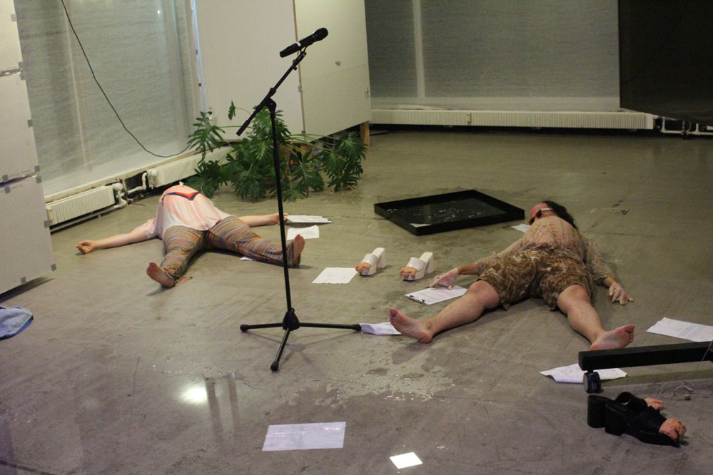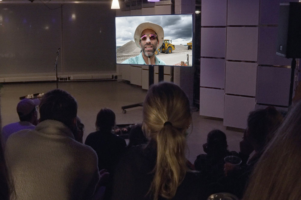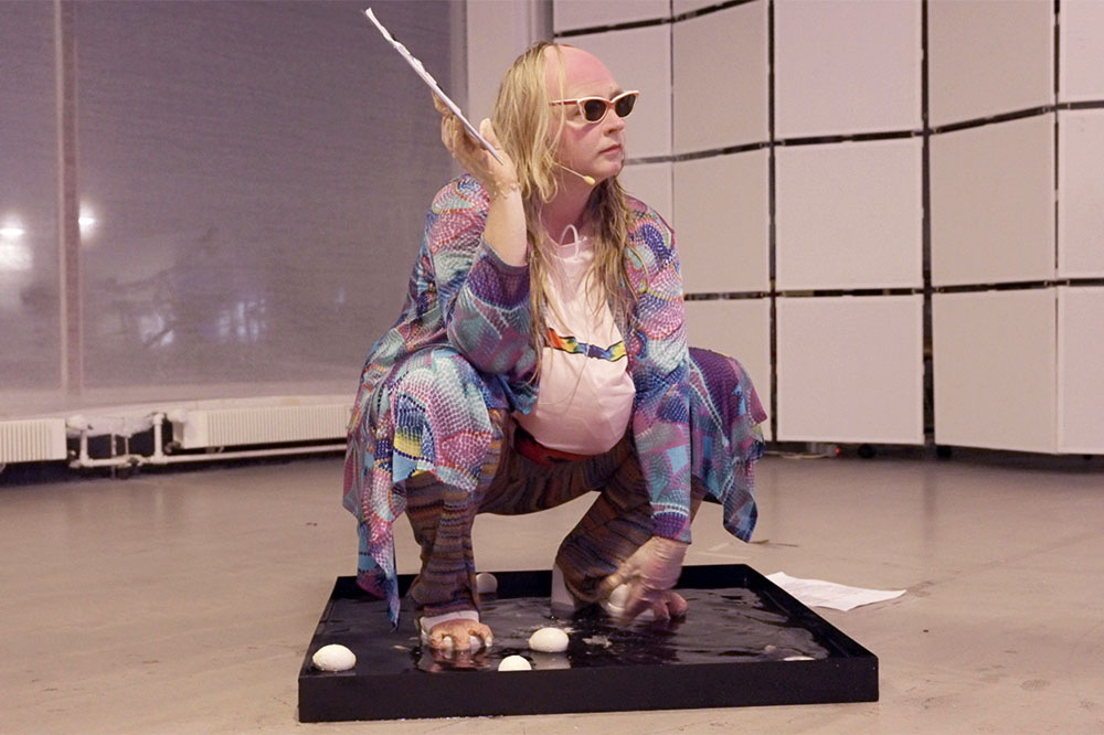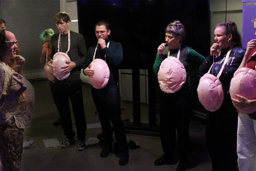 A performance that redirected past-present-future into loopy currents and tides and asked us to reflect on our understanding of manmade masses and the waters surrounding them. The performance was a guided meditation remixing poor special effects with an inflated narrative, deflated movements, familiar pop and an adapted input from the public. Building on the data gained through the Department of Reflection's first Fieldwork tour in Miami this performance builds and adapts to the specific local ecology and current discourse on man made masses in Copenhagen - where Lynetteholm is slowly becoming a reality. Misael Soto joins us digitally and shares the knowledge and experience they have from the unsustainable man made venetian islands in Miami. Art Hub BarX, Copenhagen (DK) 2022 Documentation: Bennett Van Hoff and Christian Brems