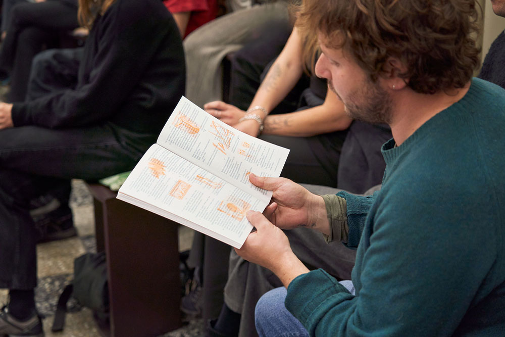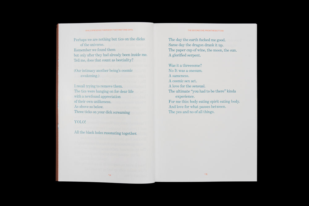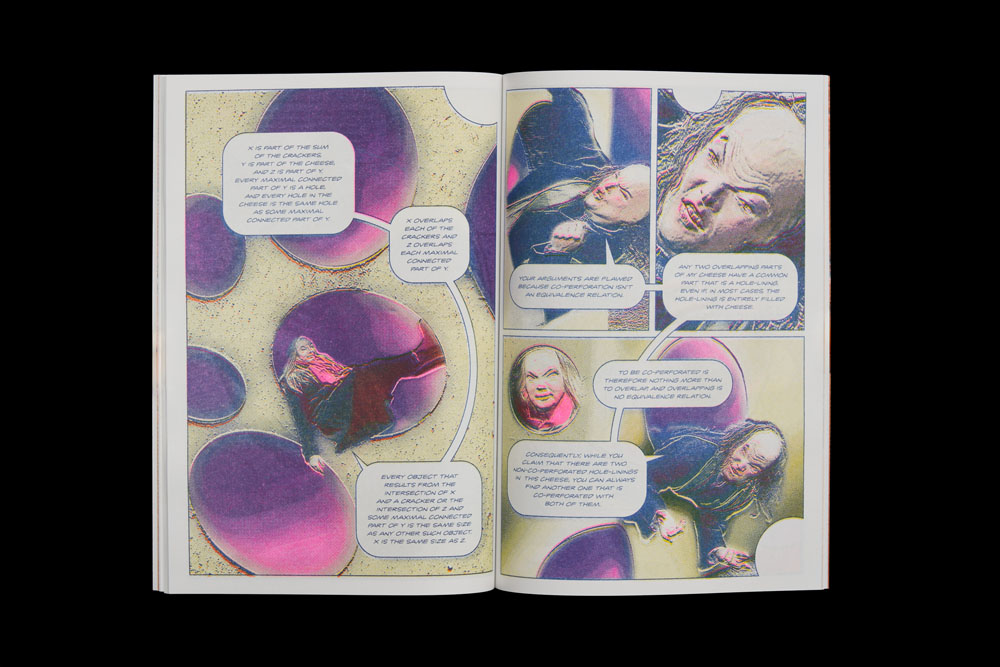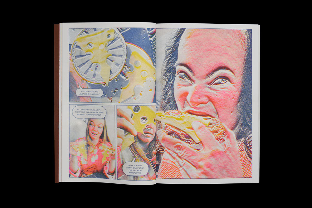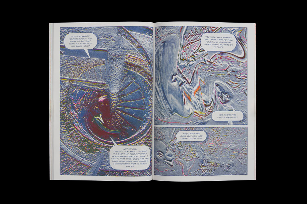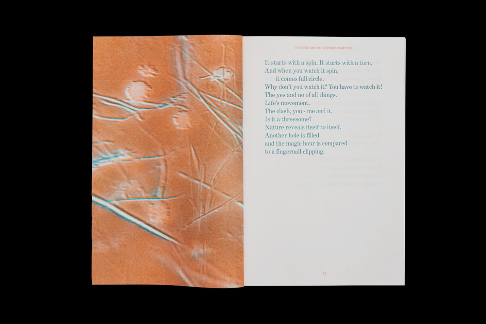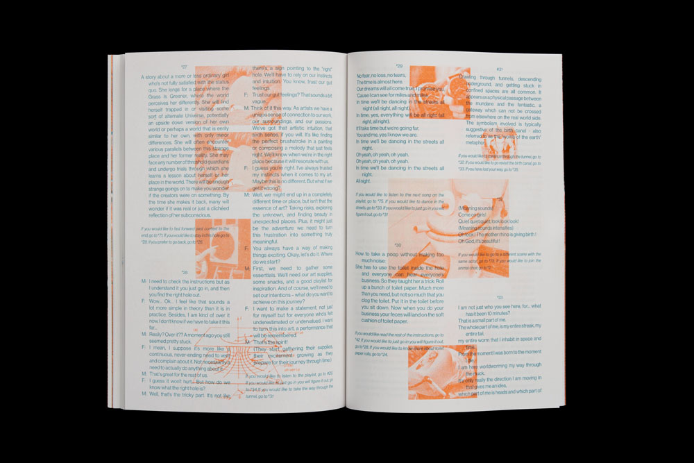 Go in, you will figure it out is a publication investigating holes as a physical and mental portal between realities. The hole serves both as a metaphor for presence in “the moment” or presents an opening to endless possibilities and “what if’s”. The book remixes theories of metaphysics and modal realism with pop cultural plot holes, familiar objects and well.. the deep existential voids of everyday life. As a reader, you are invited to make your way through the book, as a “choose your own adventure” experience, jumping from page to page, navigating its pitfalls and plot holes. Or you may choose to read the book from beginning to end - as linear. ISBN: 978-87-974599-2-8 AFT-3, 100 pages, 230x160 mm, Edition of 200 handbound, 5 color riso print Silkscreen cover, 2023 Published by Adagio for Things and Overgaden. Publication release, exhibition and interactive reading at Overgaden, Copenhagen (DK), 2023 Supported by the Danish Arts Foundation and Københavns Kommunes billedkunstråd. Documentation by Brian Kure