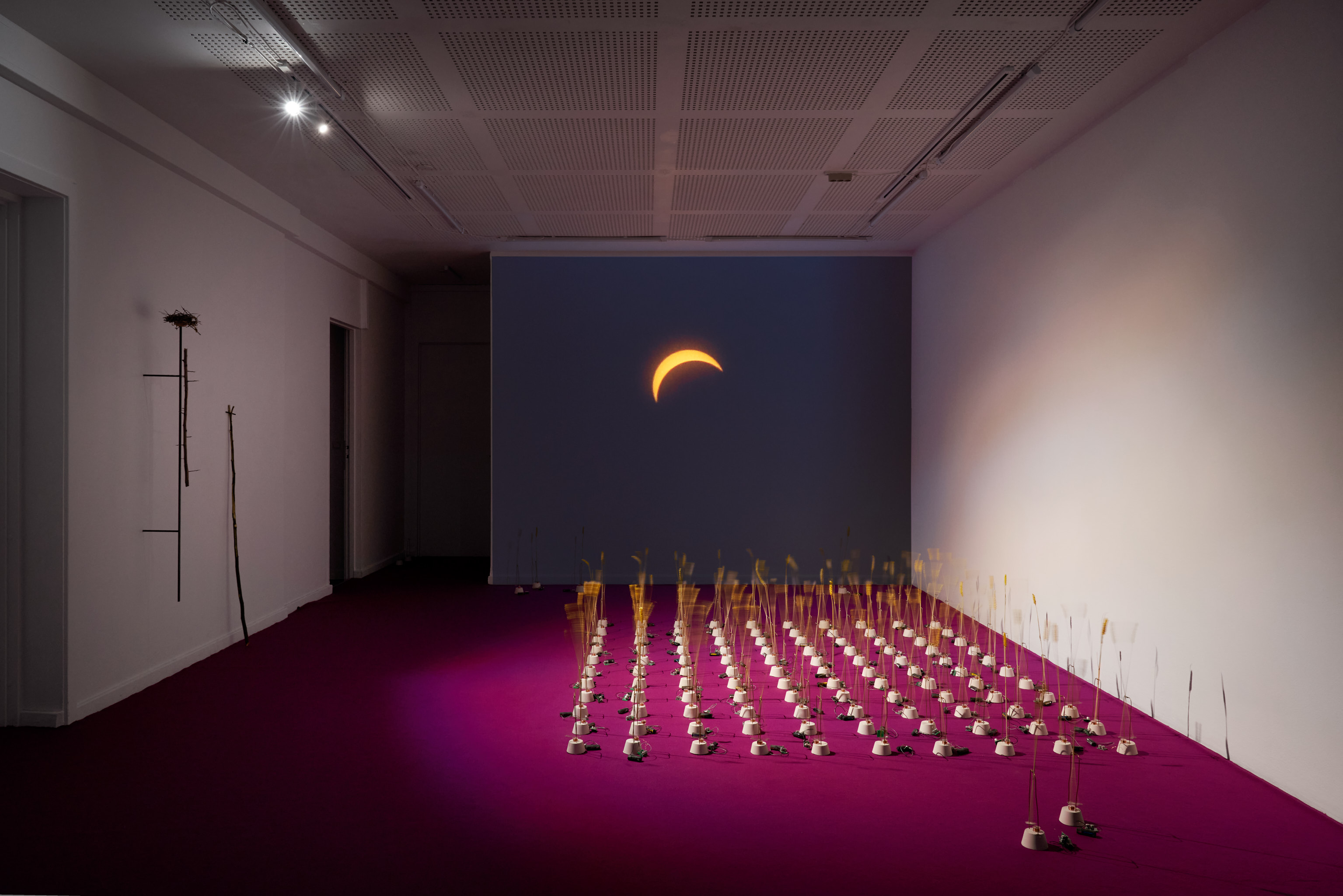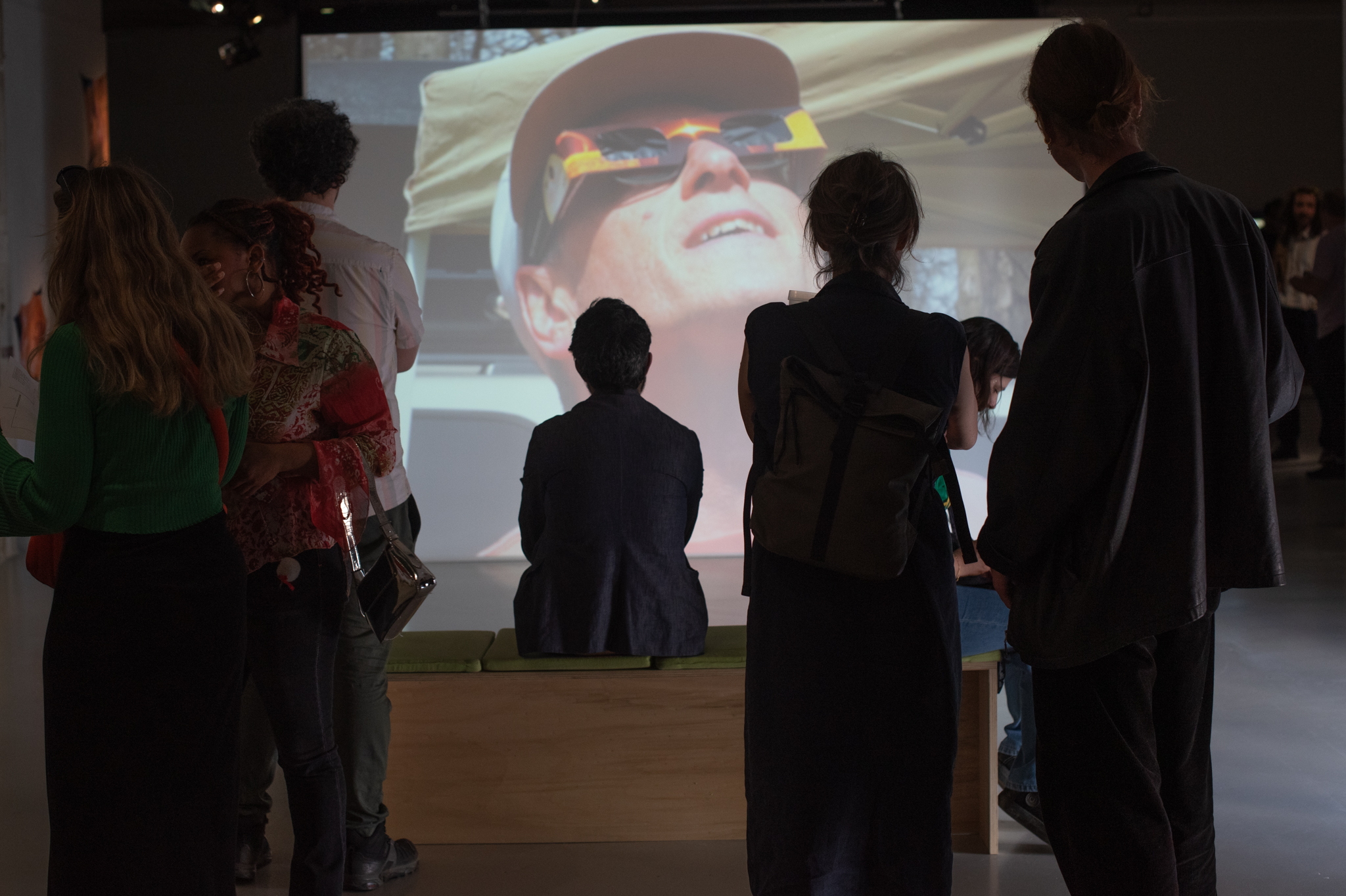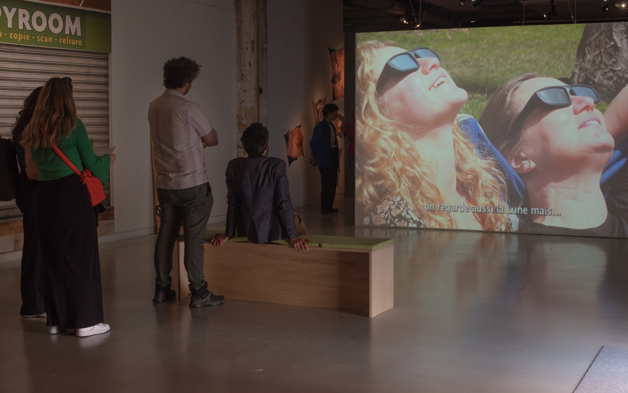 The solar eclipse, once interpreted as an ominous disruption of nature's rhythm, is now a predictable event and a pop-cultural spectacle complete with accompanying merchandise and memorabilia. In a time marked by ideological polarization and a growing need to feel connected to the world, the work explores nature’s unifying power, focusing on diverse groups that vary significantly in age, religion, and political orientation. Across these groups, the films illustrate how the artificial and human-made influence our relationship with nature. Sounds and lights from urban environments seep into the natural experience, and pop-cultural references are used as a shared frame of understanding. The artificial is employed to describe the natural; for instance, the sun’s rays are compared to film spotlights. Much like Plato’s famous cave allegory, the onlooker is compelled to question whether their experience is authentic or staged. Through an artistic approach, the project links eclipse to eclipse via a performative script that blends documentary with staged elements. The script draws on observations from previous eclipses and is directed, performed, and filmed live amidst the crowds at the event. The result is an echo, or a kind of “hesitation,” between the authenticity of the moment and the cyclical, predictable, and recreated nature of the phenomenon. Hunters and Gatherers — Group Show at Udstillingsstedet Sydhavn Station, Copenhagen, 2024 COPY ROOM, Group show at Ateliers Du Vent (FR) 2024 Supported by The Danish Arts Foundation and the Ny Carlsberg Foundation. Documentation: Brian Kure and Catherine Duverger