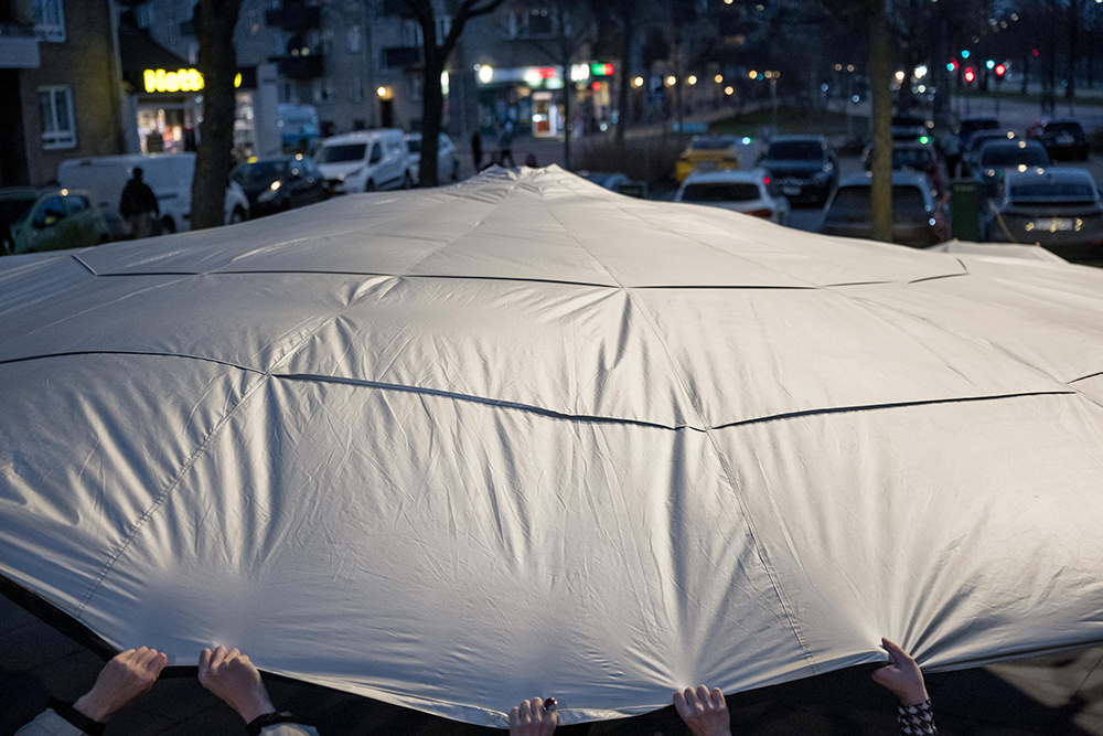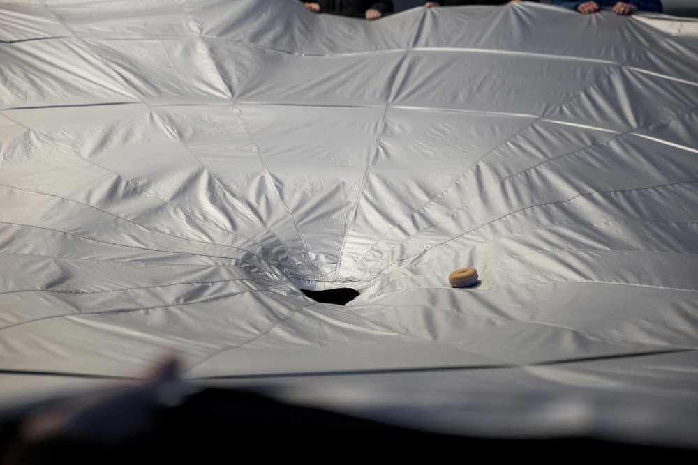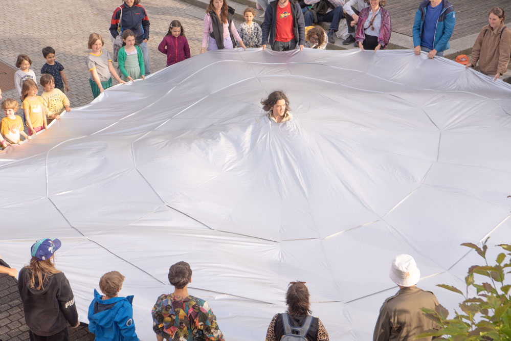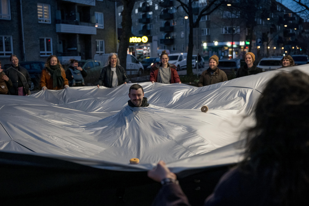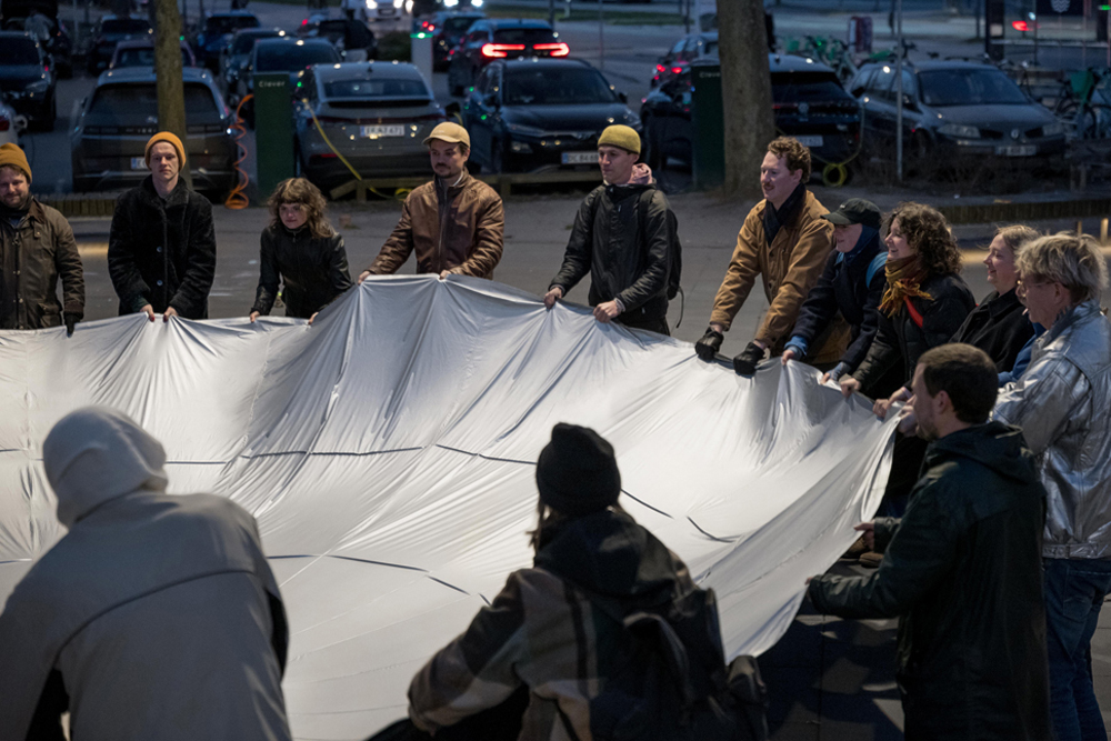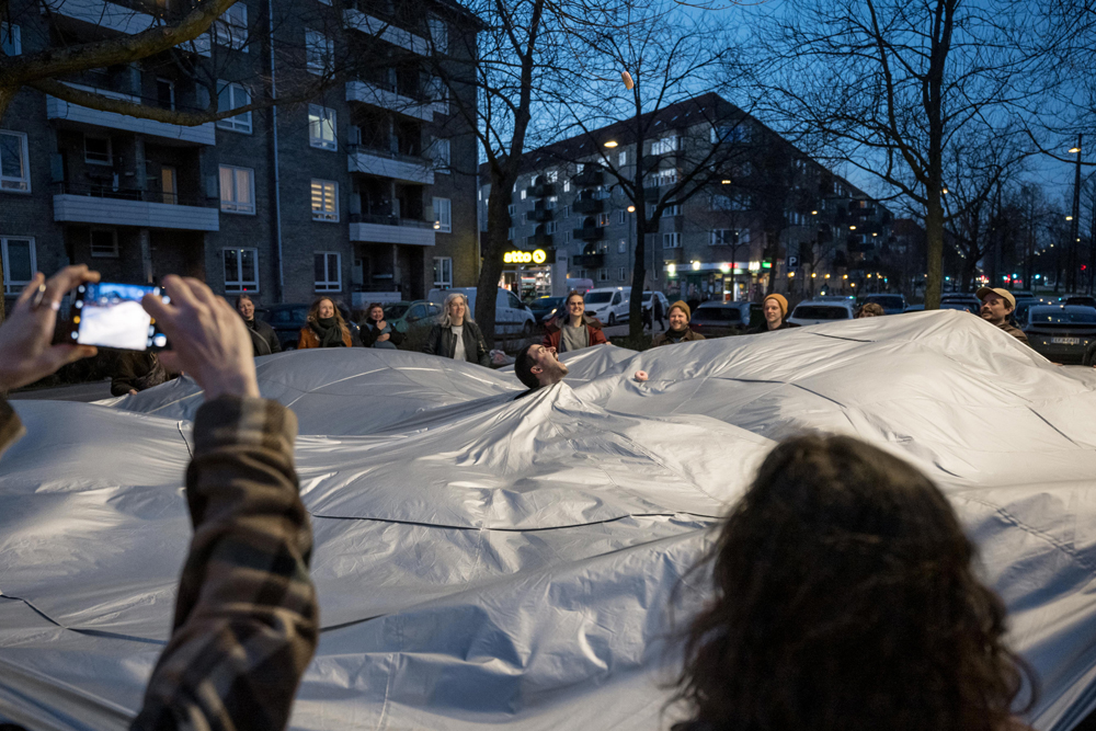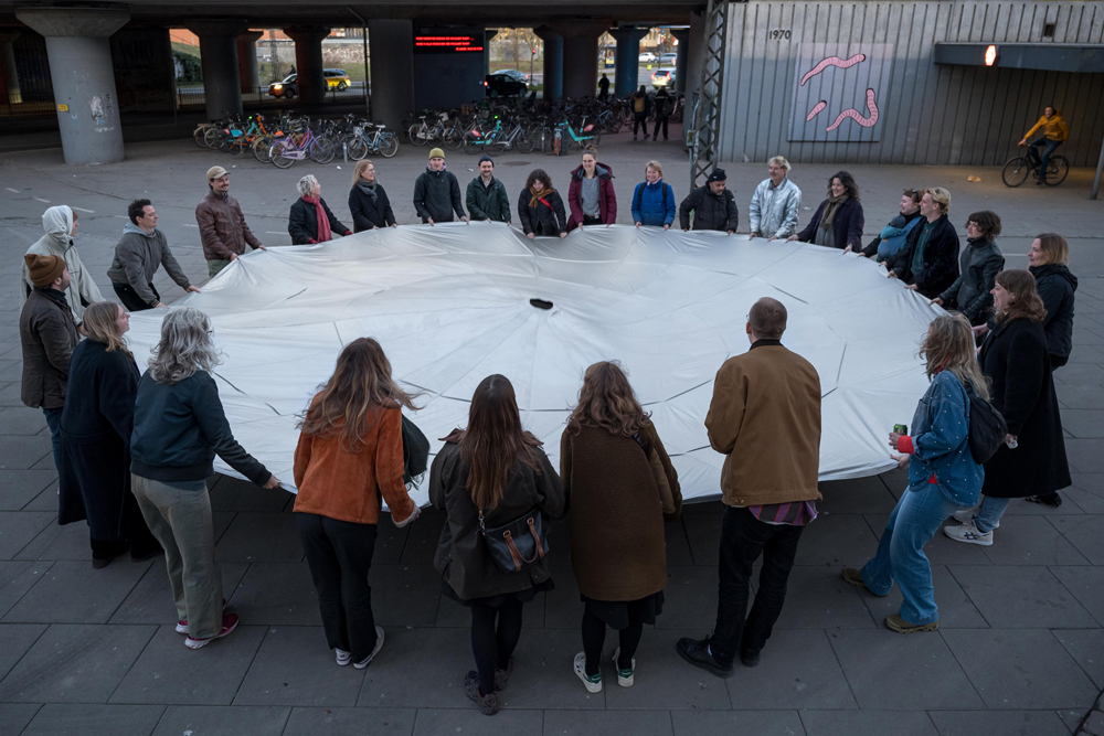 In the performance The Relation Ship, a textile sculpture expands into a space of possibilities for collective play and storytelling. Through a shared choreography, participants are guided through wormtime, transforming the sculpture into anything from gravitational waves or black holes to a wormhole or even a donut-shaped universe. Participation is central to the work: the audience co-creates the experience, becoming part of a larger whole. Each iteration of The Relation Ship builds on the last, weaving participants’ contributions into future choreographies. The result is an expanding universe of movement and co-creation. COPY ROOM, Group show at Ateliers Du Vent (FR) 2024 Supported by The Danish Arts Foundation and the Ny Carlsberg Foundation. Documentation by Catherine Duverger Wormtime, Solo show at Udstillingstedet Sydhavn Station (DK) 2025 Supported by The Danish Arts Foundation and Kobenhavn kommune. Documentation by Morten Underbjerg