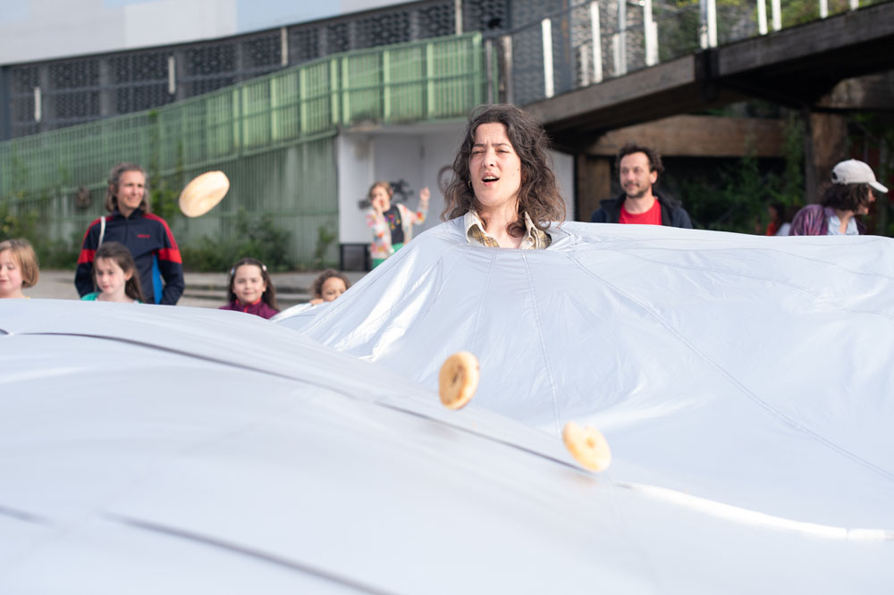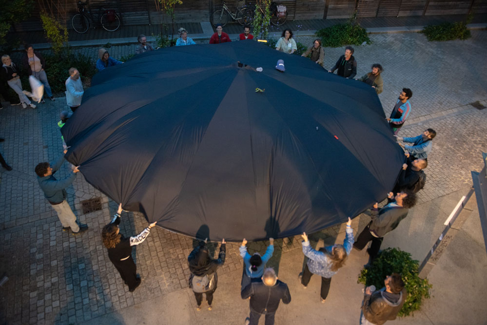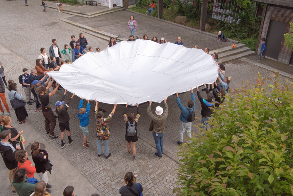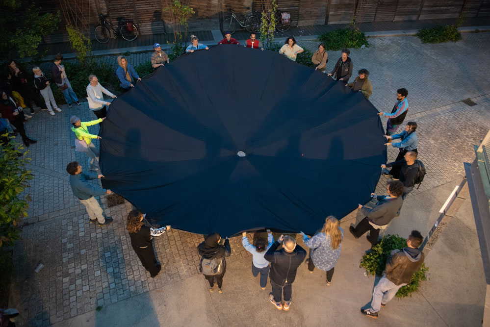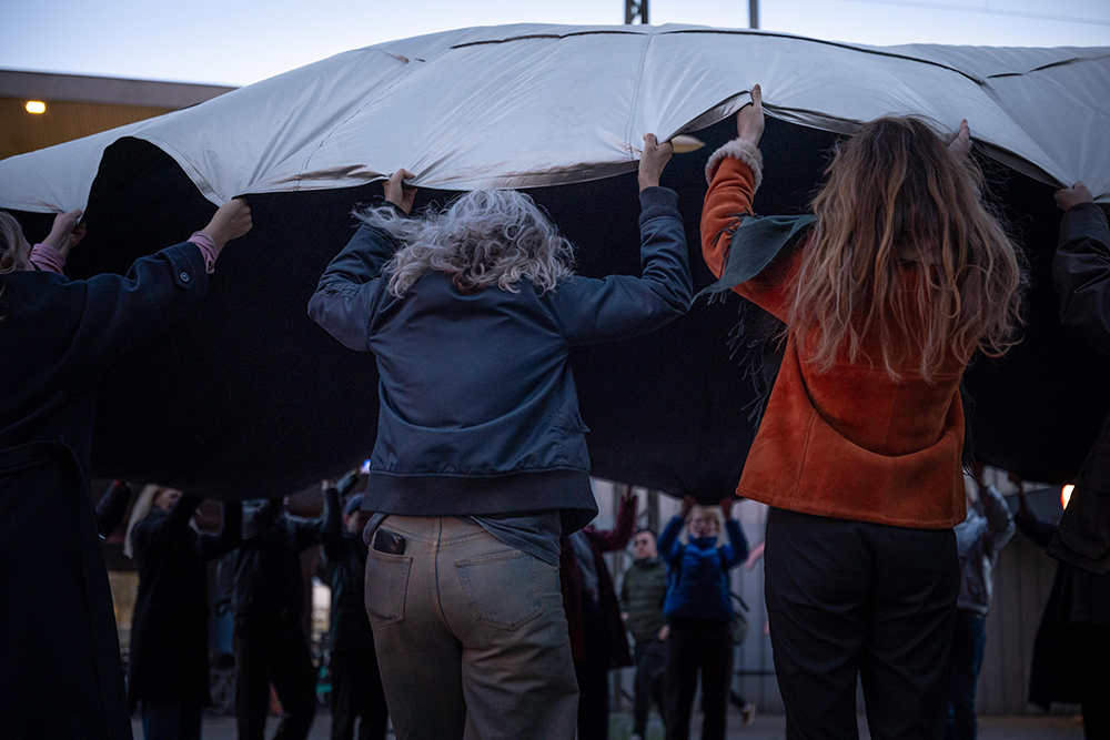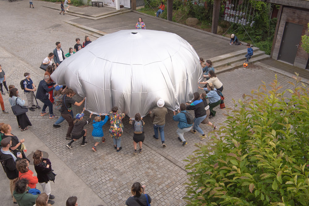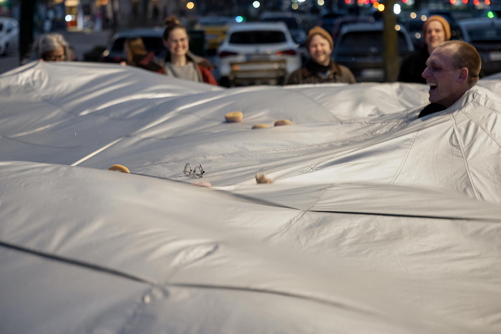 In the performance The Relation Ship, a textile sculpture expands into a space of possibilities for collective play and storytelling. Through a shared choreography, participants are guided through wormtime, transforming the sculpture into anything from gravitational waves or black holes to a wormhole or even a donut-shaped universe. Participation is central to the work: the audience co-creates the experience, becoming part of a larger whole. Each iteration of The Relation Ship builds on the last, weaving participants’ contributions into future choreographies. The result is an expanding universe of movement and co-creation. COPY ROOM, Group show at Ateliers Du Vent (FR) 2024 Supported by The Danish Arts Foundation and the Ny Carlsberg Foundation. Documentation by Catherine Duverger Wormtime, Solo show at Udstillingstedet Sydhavn Station (DK) 2025 Supported by The Danish Arts Foundation and Kobenhavn kommune. Documentation by Morten Underbjerg