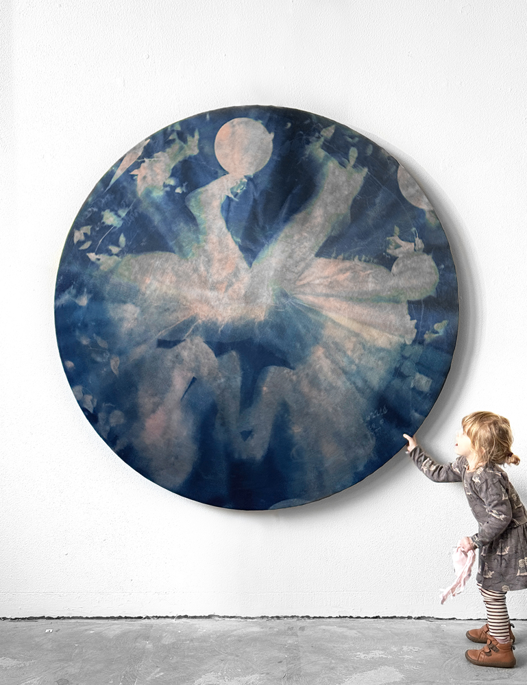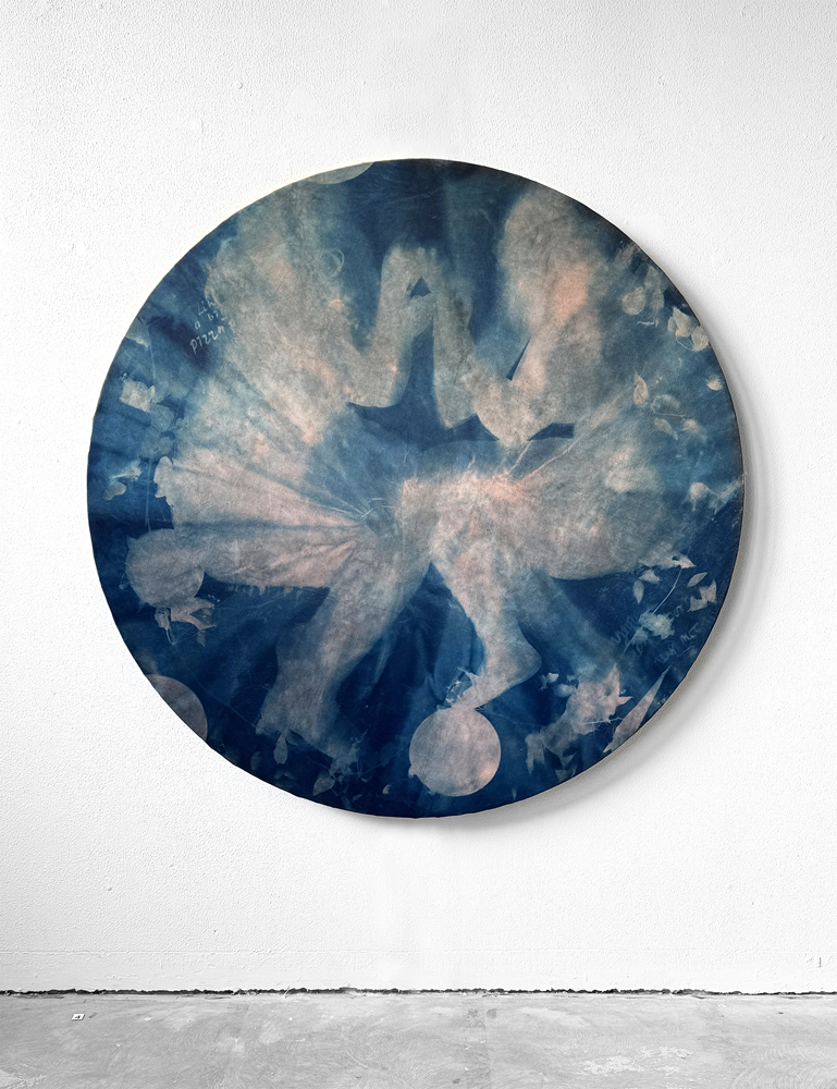 A self portrait made using the photographic technique cyanotype - also known as light print. We laid together on the ground for 5 minutes while the sun took our picture. While we were there we thought of the Lovers of Valdaro - tightly embraced in a neolithic tomb. Or two friendly doggies snuggling in a basket. We thought of the sun and the moon and of big round eyes and pizza pies. We thought about romance and annihilation. We thought about totality. The side of the round cyanotype piece is embroidered with the text: The little wheel spins and spins and the big wheel goes around and around and… The viewer is invited to rotate the wall piece. While they spin it they can listen to a 1 min audio piece made to accompany the work. TID - Group show with the Artist Association Jutland, KH7 art space, Aarhus (DK) 2025